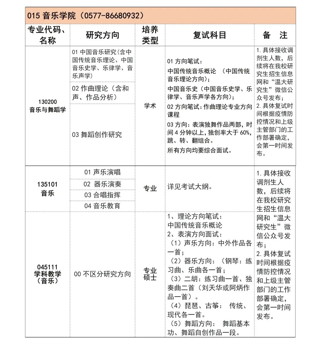 拥有“音乐与舞蹈学”一级学科硕士学位授予权,招收“音乐与舞蹈学”学术型和“艺术硕士”(MFA)、“学科教学”(音乐)专业型硕士研究生。设有音乐学(师范)本科、专升本专业。2018年时时彩