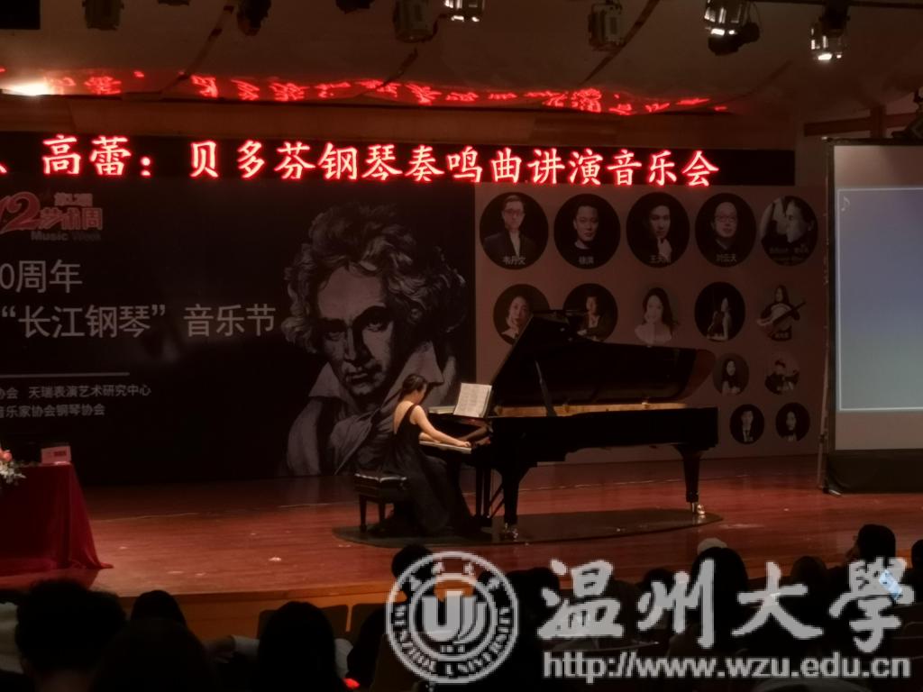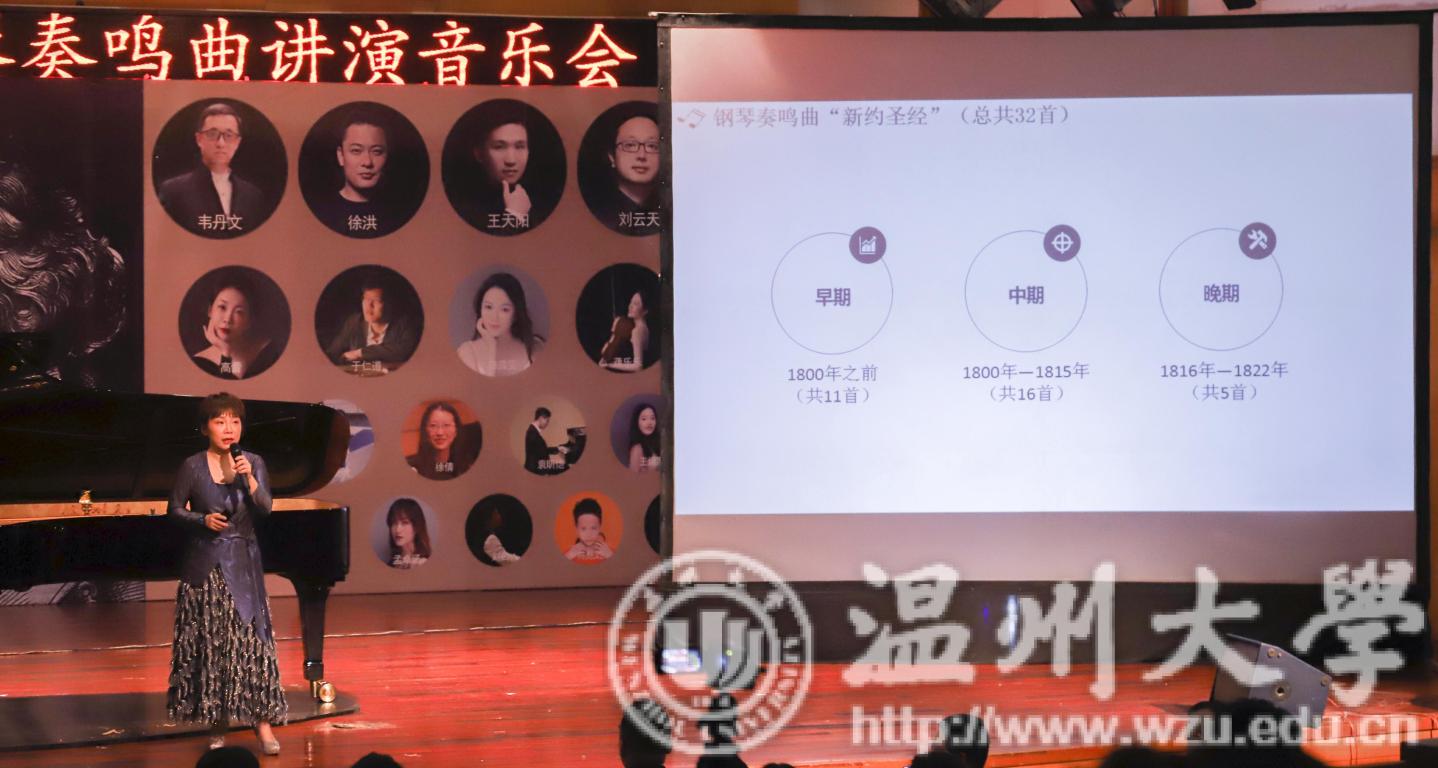 的高蕾老师为大家带来贝多芬钢琴奏鸣曲的讲演音乐会。贝多芬一生中创作了32首钢琴奏鸣曲,如同日记一般记录着他一生的追求与理想,他对奏鸣曲式的发展和创新,将古典主义音乐推向了高峰,并预示着19世纪浪漫主义音乐的到来。贝多芬的创作分为早、中、晚三个时期。
