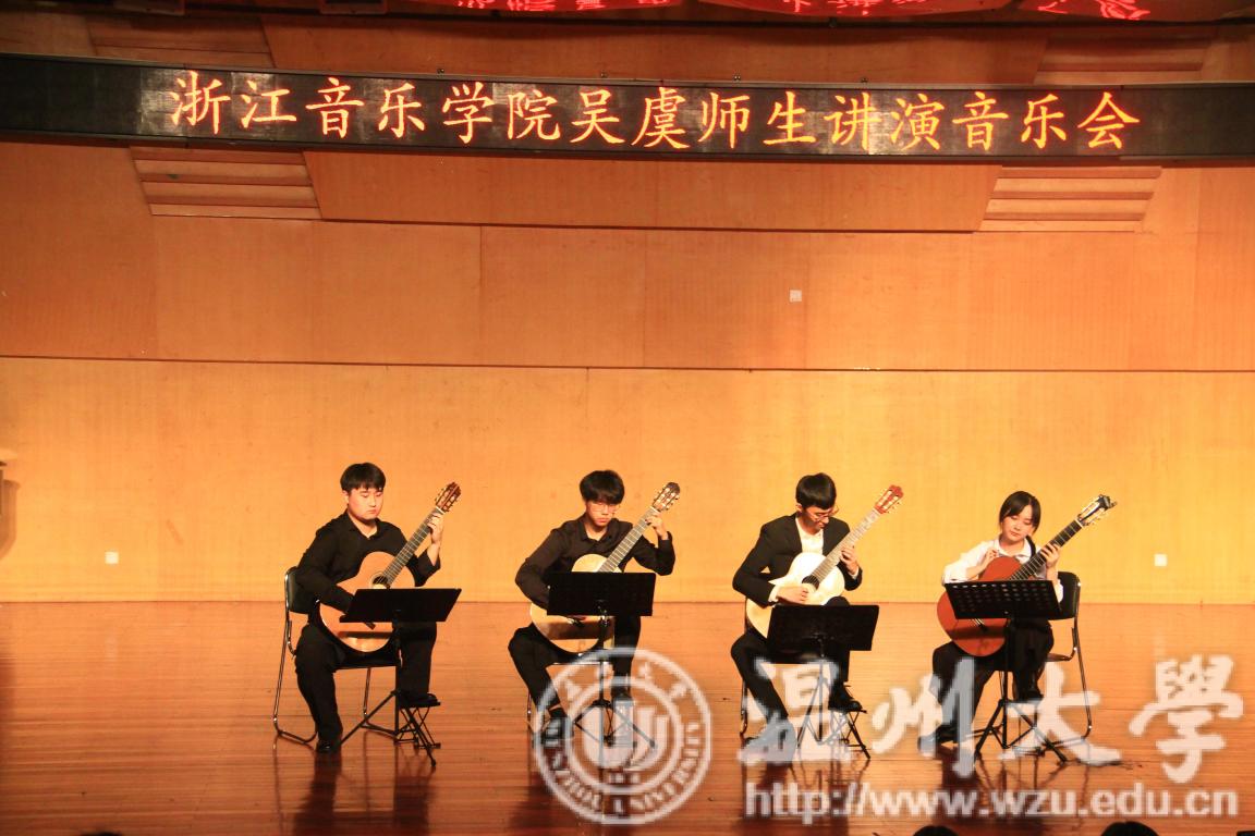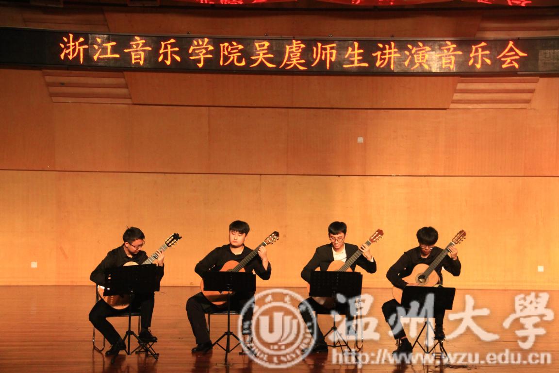 音乐会以吴虞老师的独奏拉开序幕,吉他声婉转而悠扬,仿佛诉说着对生活的向往,带有强烈的南美洲民间色彩。接下来是由江海延演奏华金罗德里戈的《三首西班牙乐曲》,只见舒缓的音乐响起,演奏者拨动吉他的弦,奏出弯曲的平行线,华光从缝隙倾限,失去在不经意间,让人心旷神怡。一曲落幕,一首极富节奏感的小奏鸣曲迎面而来,是由浙江时时彩