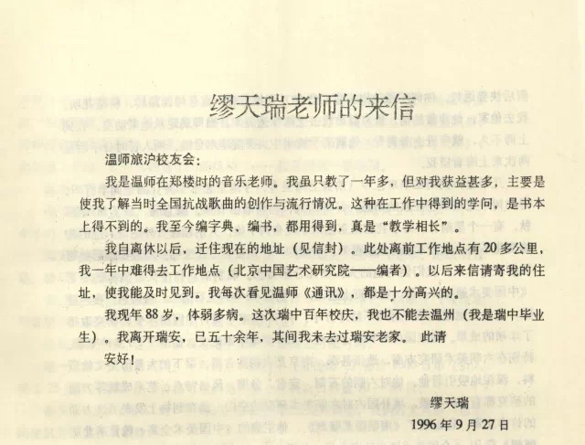 百岁学人缪天瑞先生始终牵挂着家乡温州的音乐教育事业。