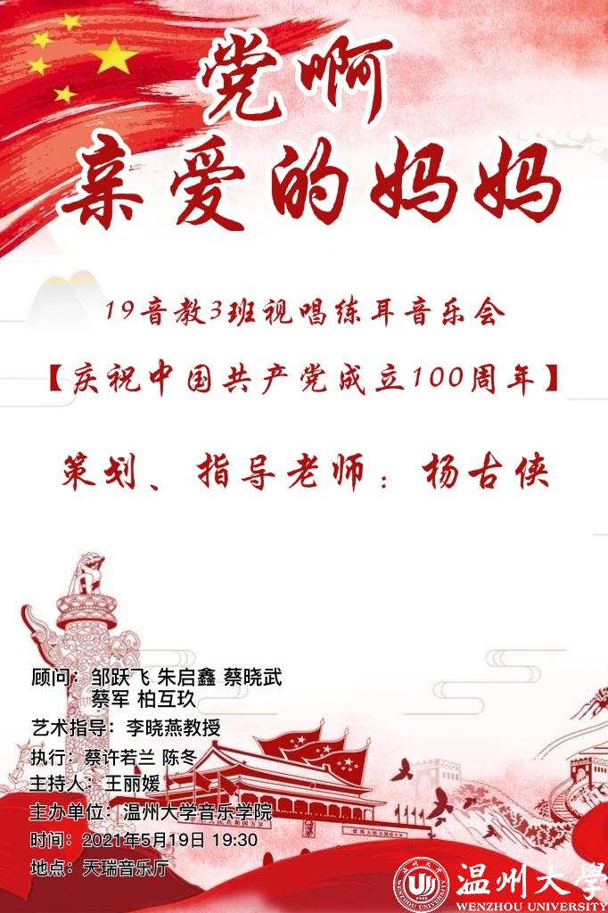 蔡军老师、蒋乐乐老师。“党啊亲爱的妈妈”视唱练耳音乐会由19音教3班出演,指导和策划为时时彩