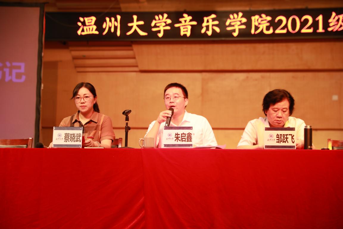 最后,院党委书记朱启鑫讲话。朱书记鼓励同学们在艺术道路上坚定理想信念,将艺术梦想与家国情怀紧密相连,提醒大家严格遵守国家的相关宗教政策,不得在校内进行传教,不得在校外参加宗教非法活动。希望同学们用党的科学理论武装自己。随后,启鑫书记抛出了三个问题。你是谁?你要到哪里去?你要成为什么样的人?朱启鑫书记强调,我们首先要认识自己,了解自己才会清楚自己想要的是什么。大学的目的不是得到面包,而是谁得到的面包味道更好。以学业为重是肯定的,同时纪律意识也要加强,规范自己的言行举止,这样子走到社会中才有立足之地。我们要在自律和规范之中成为自己想成为的人。