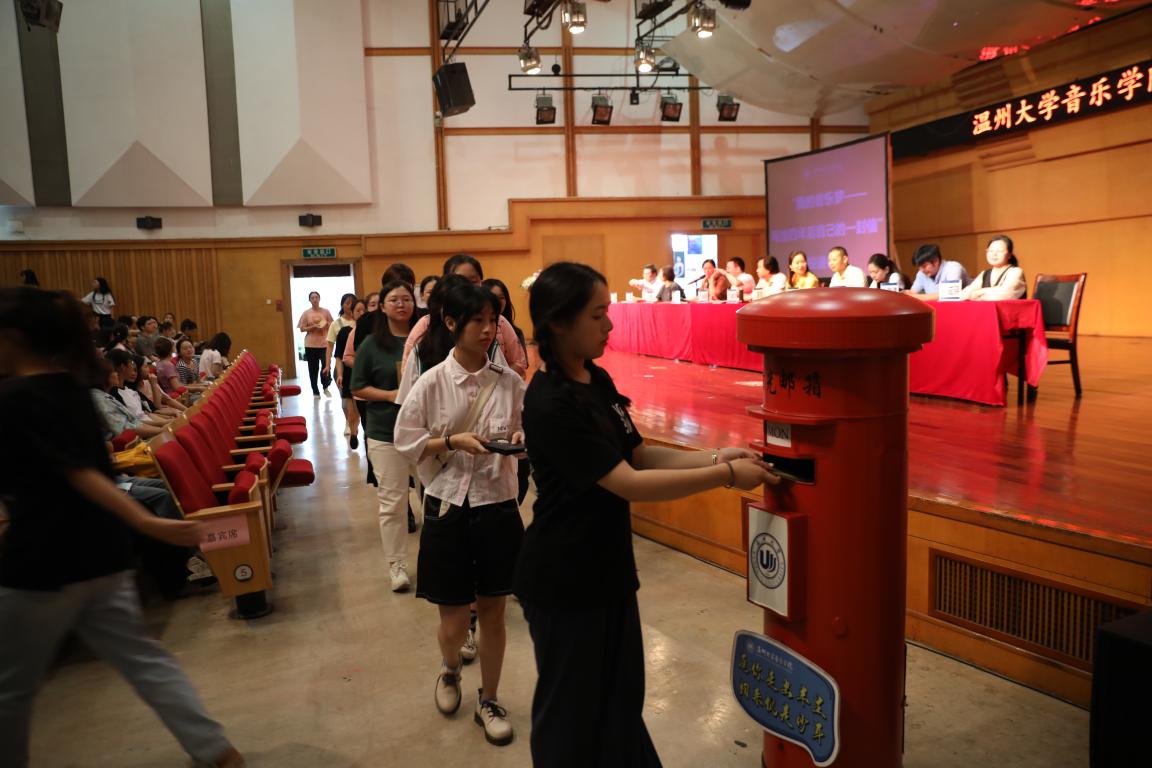 见面会上,特意对新生设置了投递四年后给自己的一封信环节。新生代表将一封封沉甸甸的信封庄重地投递到邮箱中,一张张青春稚嫩的脸庞从台上走过,四年后的他们再次打开这封信,回首今日时是否会有所触动。