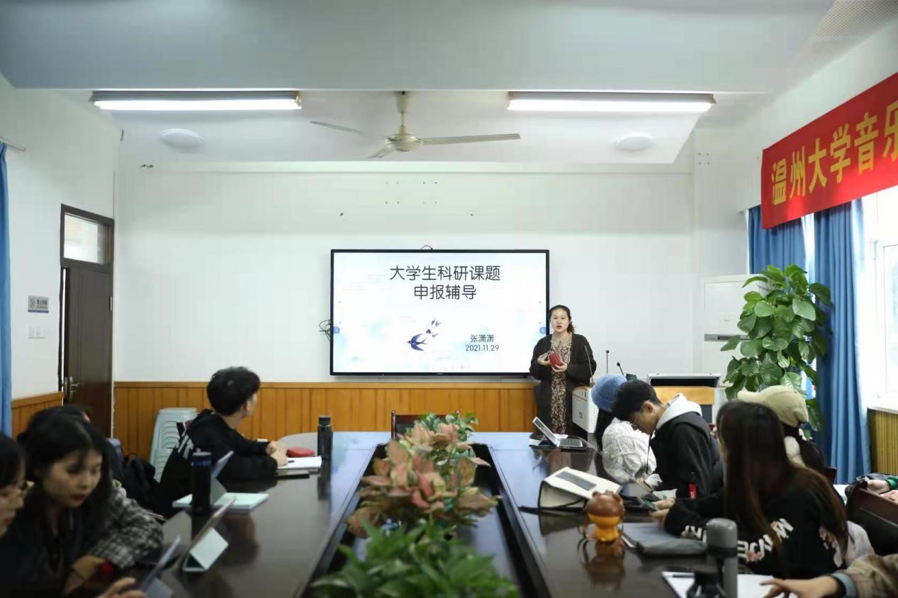 在音乐楼203会议室举行《大学生科研课题申报辅导》讲座,本次讲座由张潇潇老师主讲。