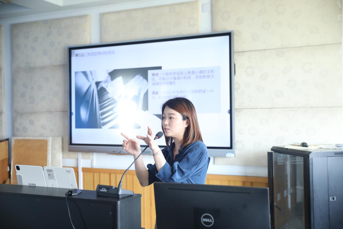 首先,陈露雯老师以《送别》作为导入,并出示主旋律,让同学们标出可以添加为伴奏的正三和弦,以此来巩固旧的知识。但是在实际演奏中,同学们发现只使用正三和弦在音乐效果上会略显单薄,于是再此基础上,陈老师引入了本次课程的重点副三和弦。副三和弦能与三个正三和弦形成和声色彩上的对比,起到了调剂的作用。同时,副三和弦用在同功能正三和弦之后,还能形成功能内紧张度及不稳定性的递增。紧接着,陈老师将理论与实际结合,让同学们以小组或个人的形式使用正三和弦与副三和弦为《送别》添加伴奏。最后,陈露雯老师总结到,副三和弦的运用丰富了和弦的根音关系,在低音部可以形成平稳流畅的旋律线条,加强了低音部的流动感。因此在即兴伴奏中,正三和弦和副三和弦都是必不可少的部分,同学们在即兴伴奏时,也要合理使用两种和弦。