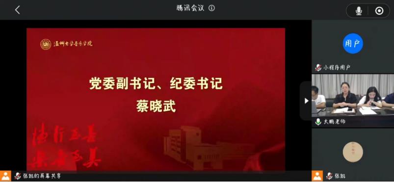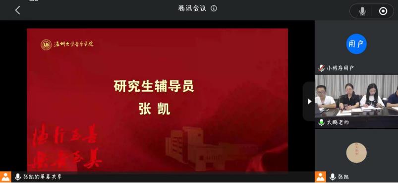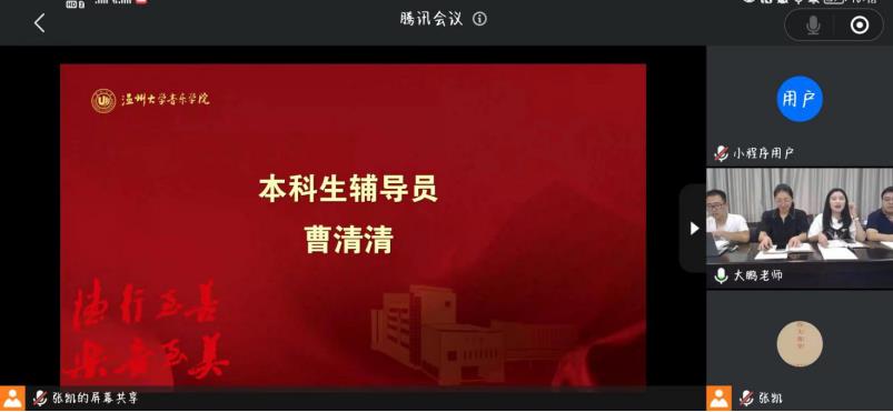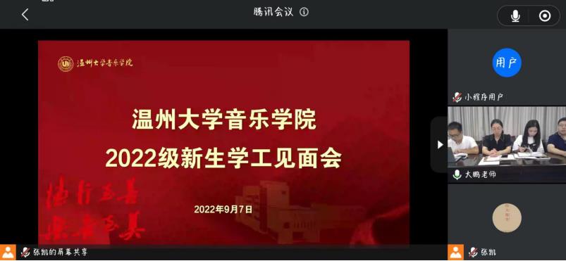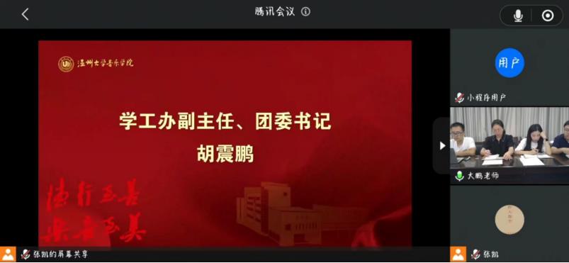 学工办全体成员在“云端”和260名新生“云端会晤”。参与此次新生学工见面会有党委副书记蔡晓武老师、学工办副主任胡震鹏老师、辅导员曹清清老师、张凯老师。见面会由胡震鹏老师主持。