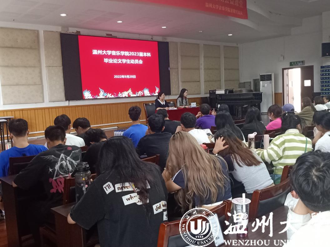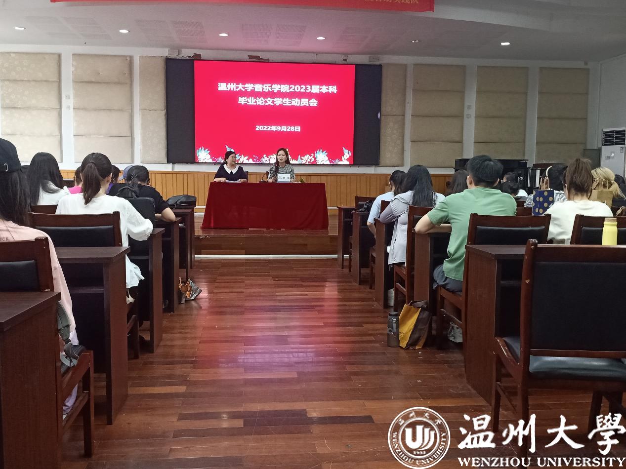 2023届本科毕业论文学生动员会。参加本次动员会的毕业班有19音教、21音乐学(师范)专升本共计6个班级,180人,本届毕业论文全部以论文的形式开展,大会由教学副院长蔡军老师主持。