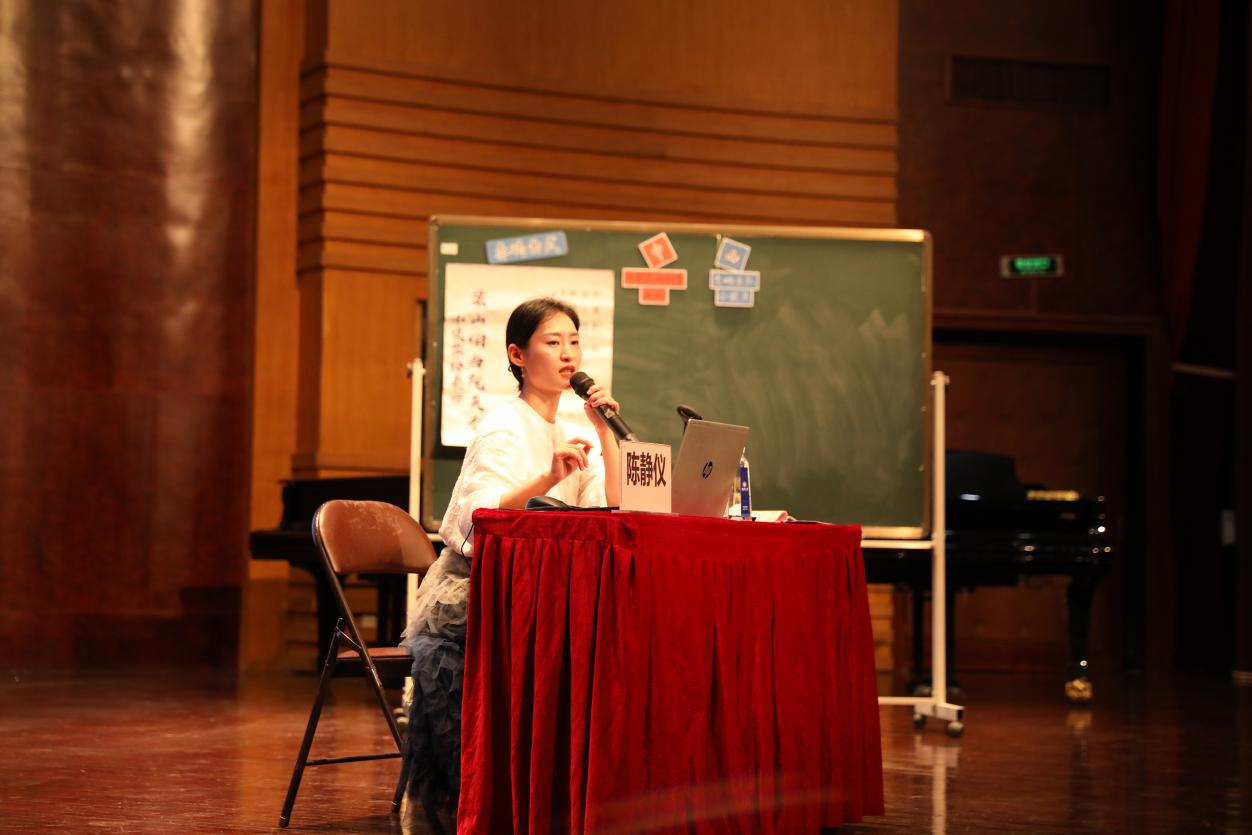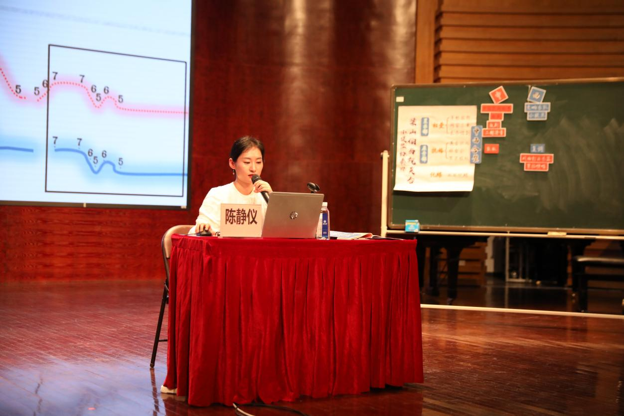 讲座伊始,陈静仪老师用温柔的语气为我们缓缓讲述了构课的思路,并且以云南民歌《小河淌水》为例子明确的阐述了教学目标,为师范音乐生上示范课提供了一个清晰的思路。随后,陈静仪老师将《梁山伯与祝英台》的PPT课程详细拆分。从构课思路是“中西合璧”到“如何通过音乐表现作品的意向以及思想情感”,从引导学生自主思考到教授内容详细解释。陈老师充分激发了同学们的思考能力,将专业知识内容与视频和互动游戏结合了起来。在讲座的末尾,陈静仪老师特别提醒到:对讲课内容一定要有取舍,注意课堂的内容重点以及课堂的时间分布。