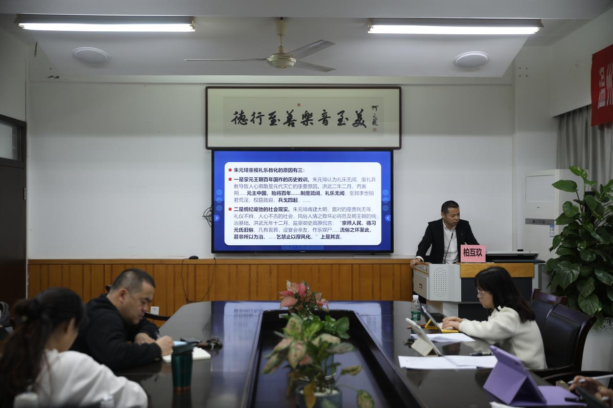 第四场,柏互玖教授的课题为《革故鼎新:朱元璋与明代礼乐社会的形成》,柏教授首先从国家礼乐制度讲起,提出朱元璋重视礼乐教化的三个原因,最后得到朱元璋从两个方面构建天下一体化的礼乐制度的观点。进而又提到时时彩