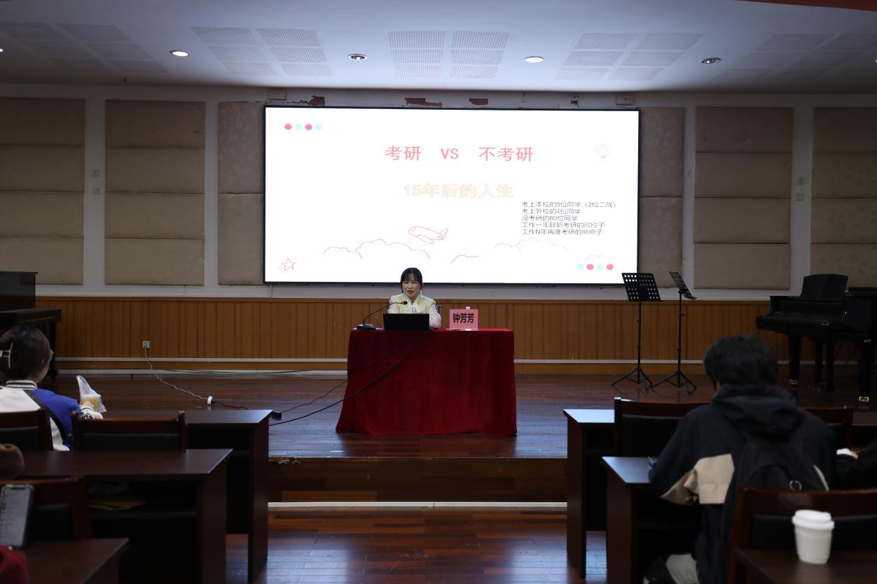 讲座开始,钟芳芳老师先给我们分享了一段她自己以及她朋友的考研故事。考研VS不考研的不同学生15年后过上了不同的人生。钟芳芳老师强调我们不要跟风考研。我们根据四个方面来规划:1.自身情况;2.毕业要求;3.经济能力;4.未来规划。并给我们展示数据告诉我们现在考研多有卷!报考人数在不断增加,但是录取率在下降。钟芳芳老师一直在教我们一句话“至少卷过室友”“至少卷过同专业人”!