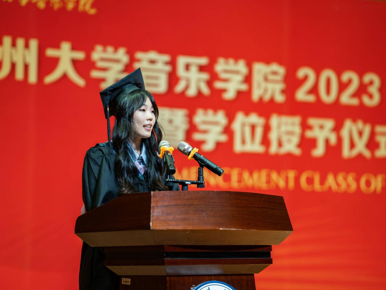 毕业典礼在庄重的全体齐唱国歌声中拉开了序幕。“玫瑰留在了盛夏,蝉鸣止于了仲夏。这是离别的季节,也是收获的季节。”院长邹跃飞在对毕业生的致辞中提到:“在这美好的大学时光里,你们寒来暑往,勤学不辍,以坚韧的毅力和优异的成绩完成了学业。从琴房、舞蹈楼、教学楼,到操场、宿舍、食堂、图书馆、到音乐厅及各种艺术舞台,到处流淌着你们青春的汗水,到处弥漫着你们青春的气息。在你们参与的各种文化活动和社会实践中,不断提高着你们的创造才华和创新能力。”邹跃飞对毕业生提出了未来发展的要求:“希望你们今后不管身处何地,面临何种境况,都不要放弃对艺术的追求,正直做人、踏实做事、要学会尊重他人、真诚待人,特别是要学会宽容和理解,以友善宽容的心态妥善处理好各种关系,用音乐温暖人心,传递正能量。你们一定要理解“学艺先学德,做戏先做人”的深刻要义。”邹跃飞表达了对毕业生深深的祝福:“愿即将踏上工作岗位、开启新的学习旅程的你,博学强记,服务桑梓;砥砺耕耘,精专艺能;用闪亮的青春谱写属于自己的华丽乐章!”