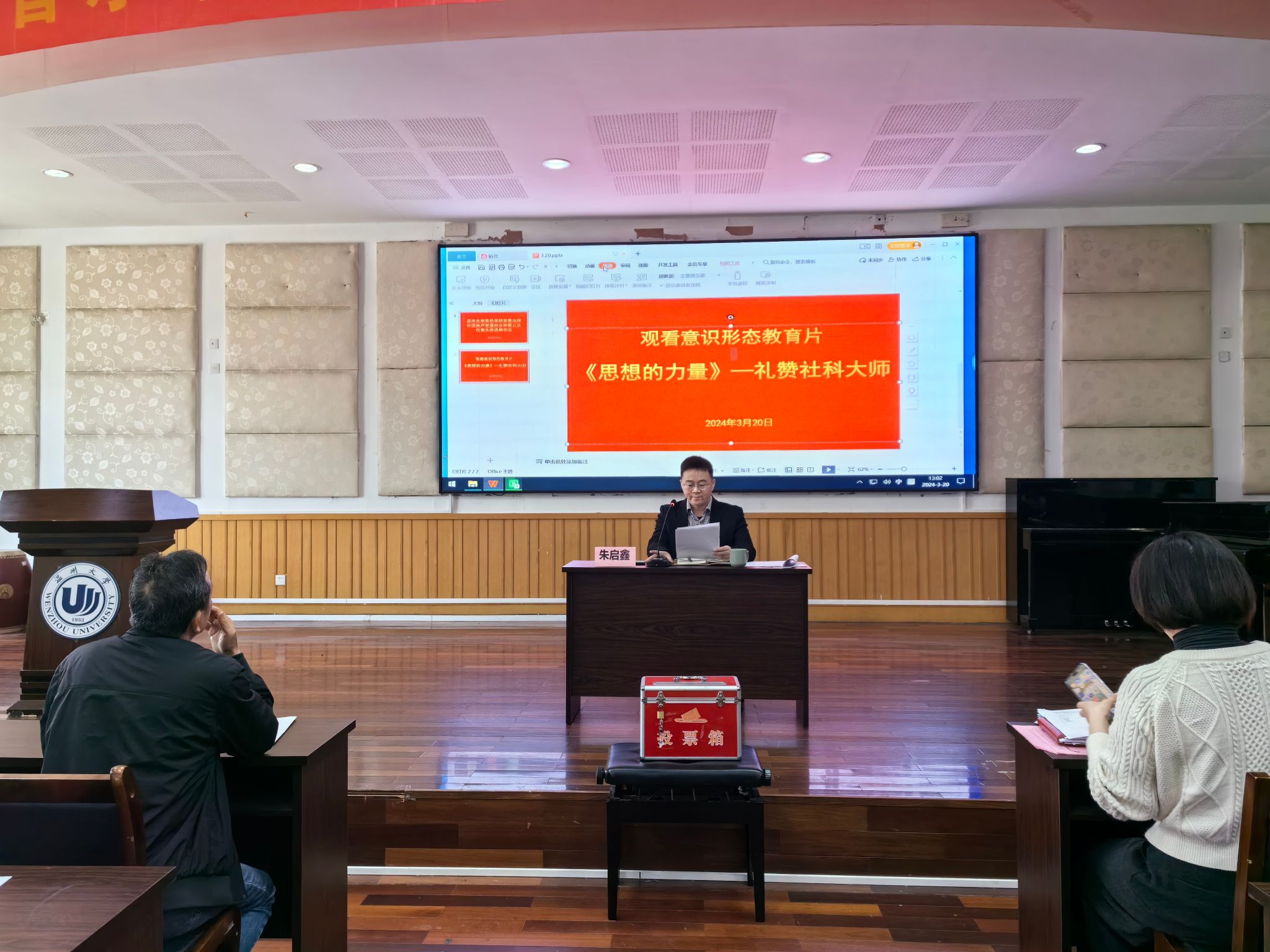 全体教职工观看了纪录片《思想的力量》礼赞社科大师。《思想的力量》纪录片从以下四个篇章进行讲述:报国之志、笃学之功、创新之能、育人之才。纪录片选取了复旦大学前校长陈望道、上海社科院前院长张仲礼、古建筑学家陈从周、地理学家胡焕庸、哲学家冯契、上海戏剧时时彩