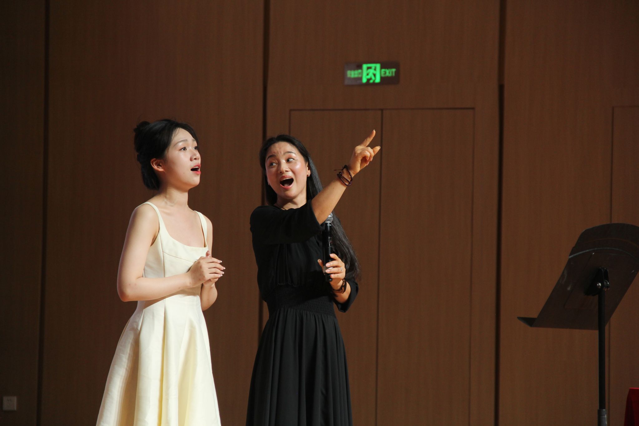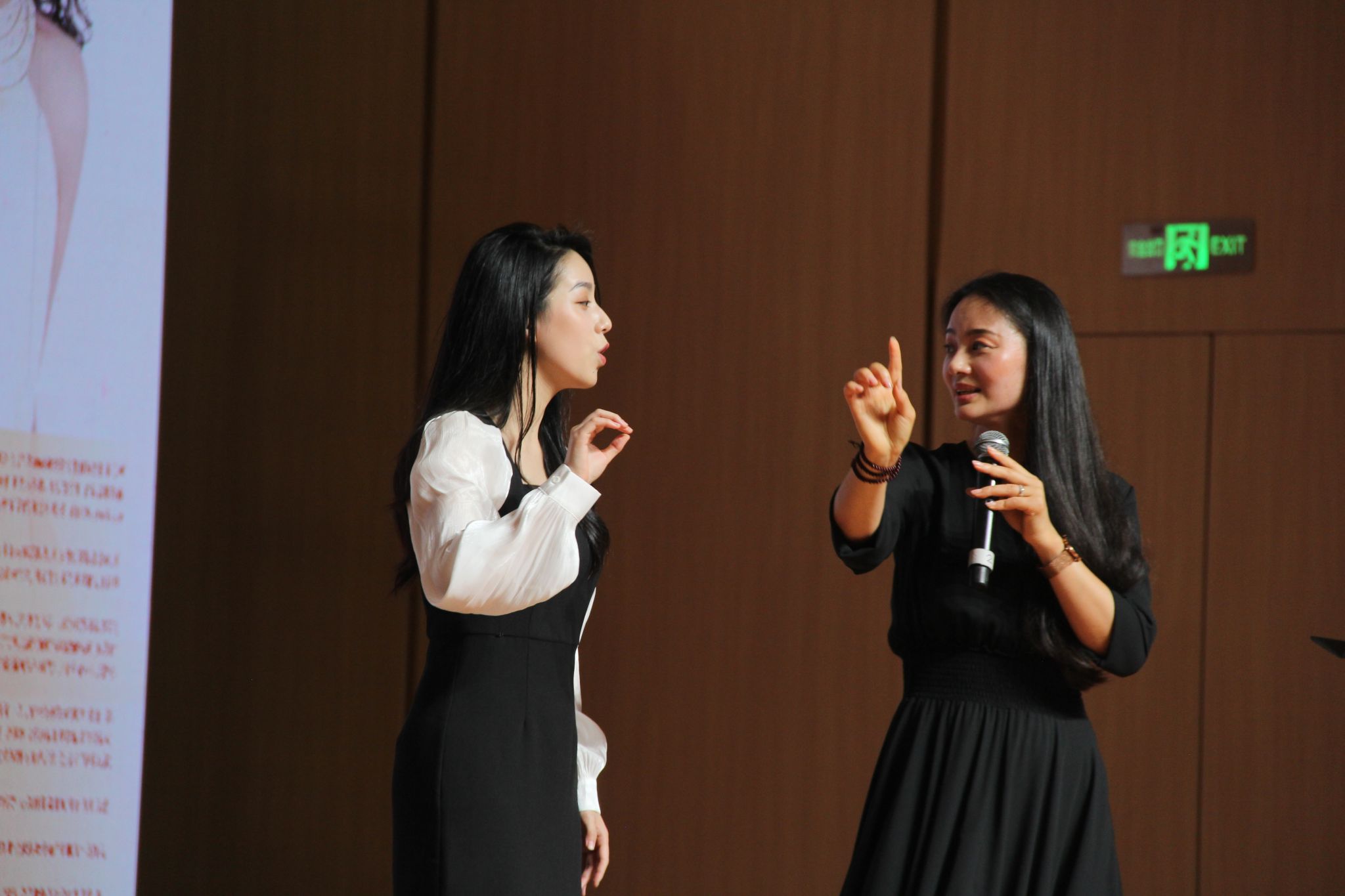 潘小芬老师认真聆听每位同学的演唱,不仅给予了充分的鼓励和肯定,还悉心提出了指正意见,并亲自示范演唱技巧。她耐心地一次次调整细节,确保每位同学都能从中获益,提升自己的演唱水平。整场活动不仅增进了师生间的交流与理解,更让同学们深切感受到了音乐的魅力与力量。