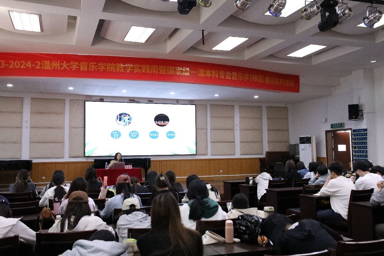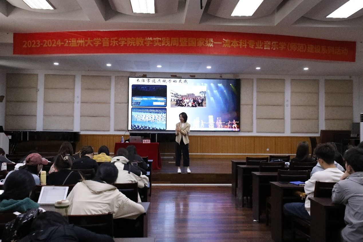 在音乐楼201学术报告厅举行了教学实践周教育研习活动,本次活动主讲老师是温州市实验中学陈淑丹老师,讲座主题是《群舞编排中道具使用的巧妙策略》,21舞蹈教育(师范)、22舞蹈教育(师范)全体同学参加了本次活动。
