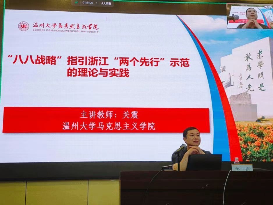 关震老师从“两个先行”的产生与内涵、"八八战略”指引“两个先行"的内在逻辑、"八八战略”指引温州“两个先行”发展三方面进行授课。他将“八八战略”实施以来的各项数据指标和突出成果进行综合分析,为我们直观呈现了“八八战略”对于温州的显著影响。他认为,在当下,美好蓝图已经绘就,前进号角已经吹响。作为温大学子的我们既已生逢其时,更应牢牢把握此番大好形势,为浙江、为温州,贡献属于我们的青春力量。