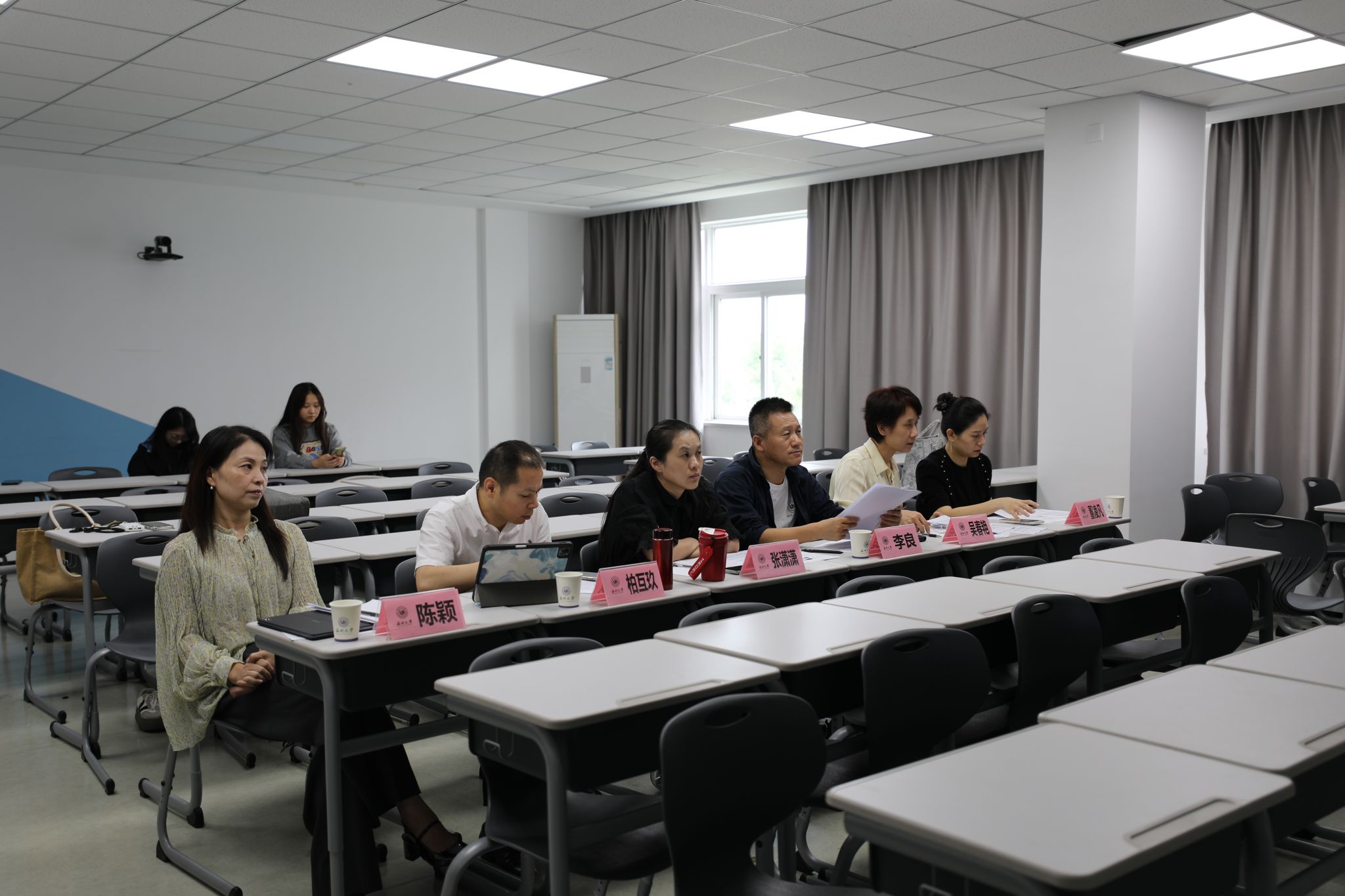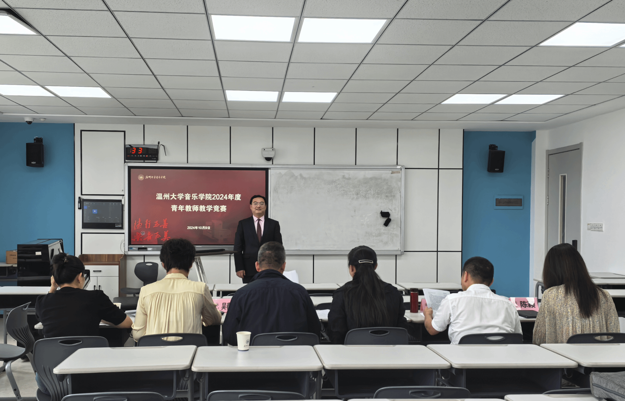 2024年度青年教师教学竞赛在北外语楼408教室举行。此次竞赛共有3 位教师参加,评委有教学副院长张潇潇副教授、音乐学系主任柏互玖教授、 舞蹈系主任李良教授、器乐系主任董凌凡副教授、音乐学系吴春艳副教授、钢琴系陈颖副教授。