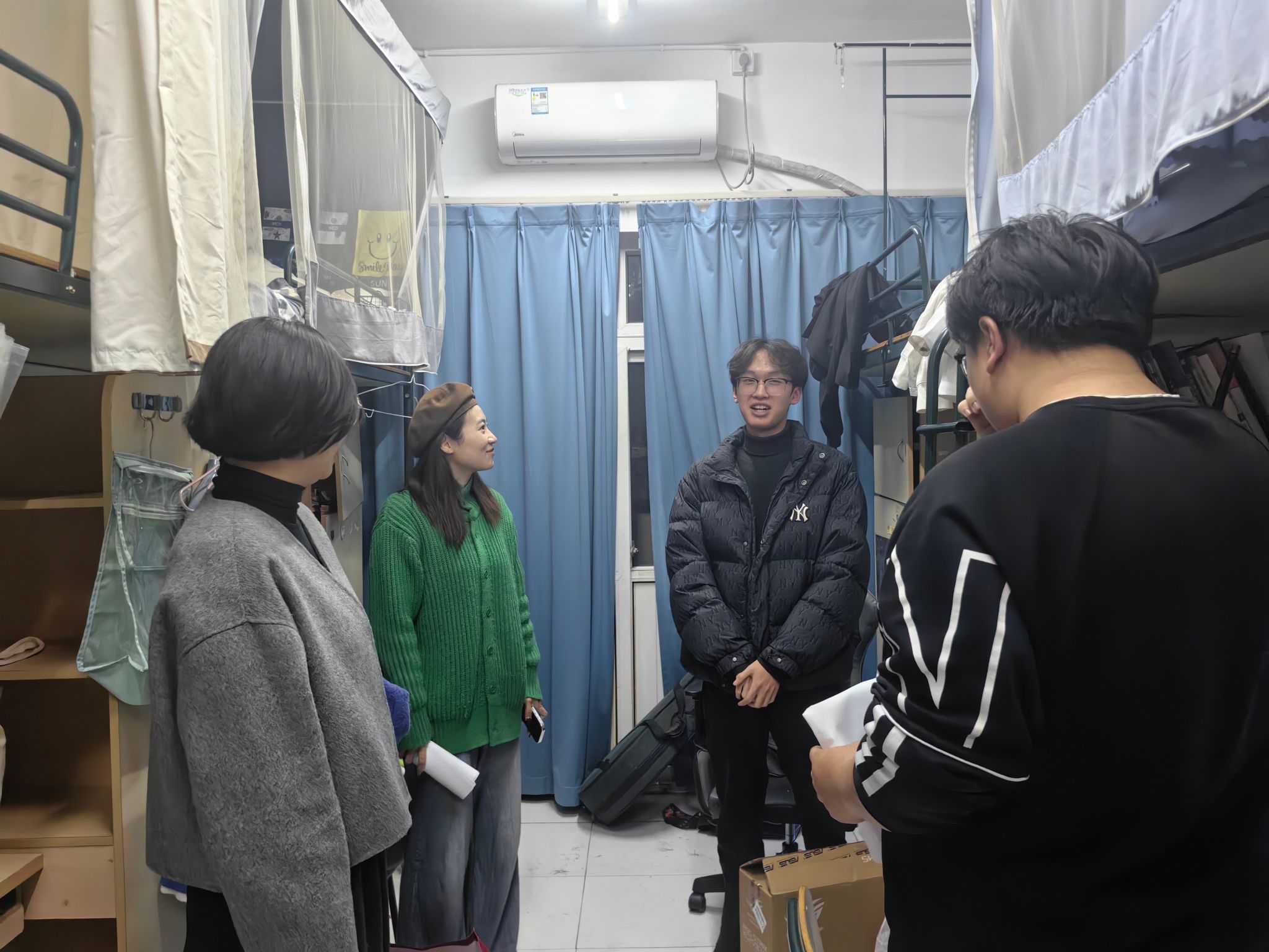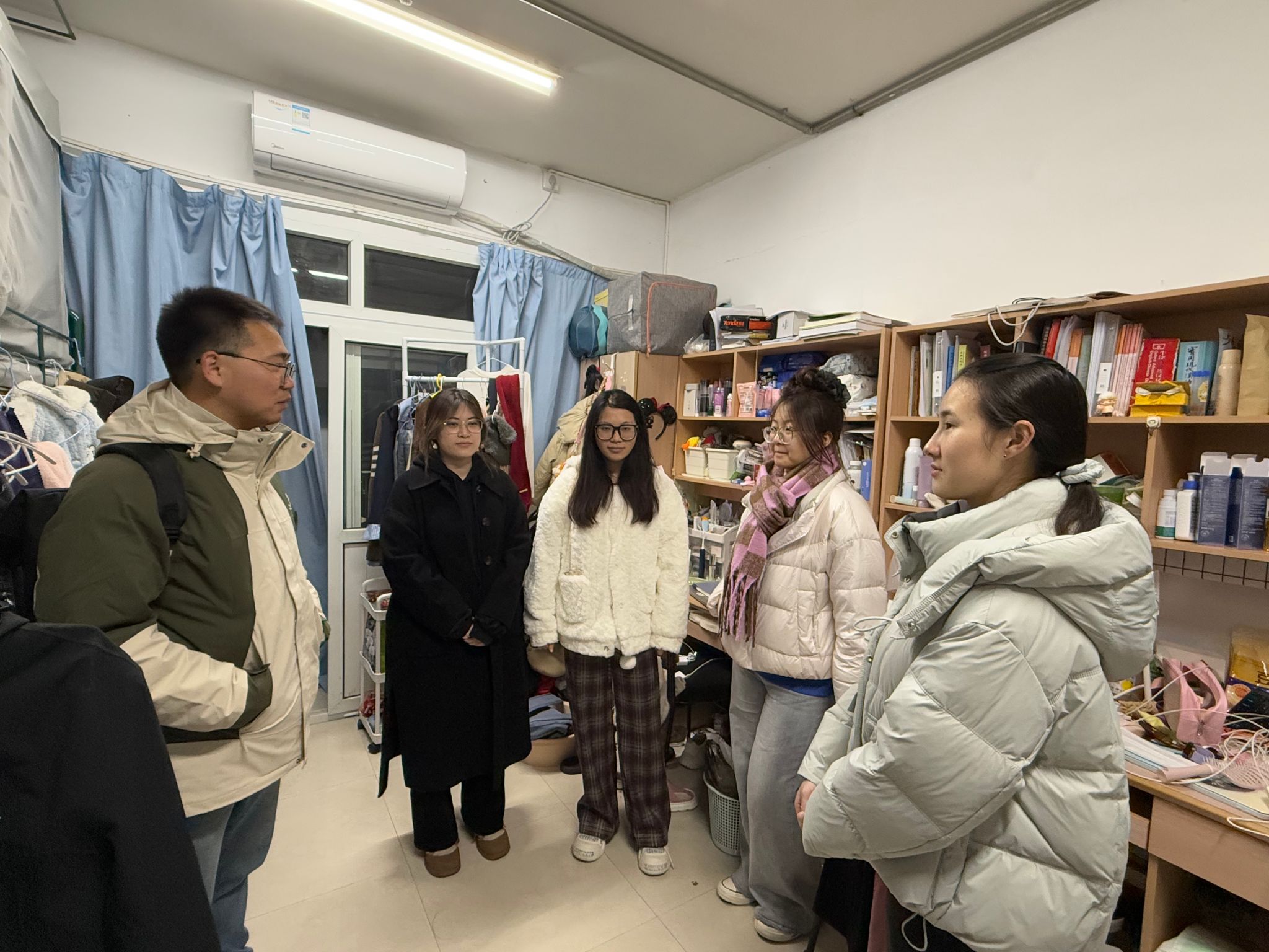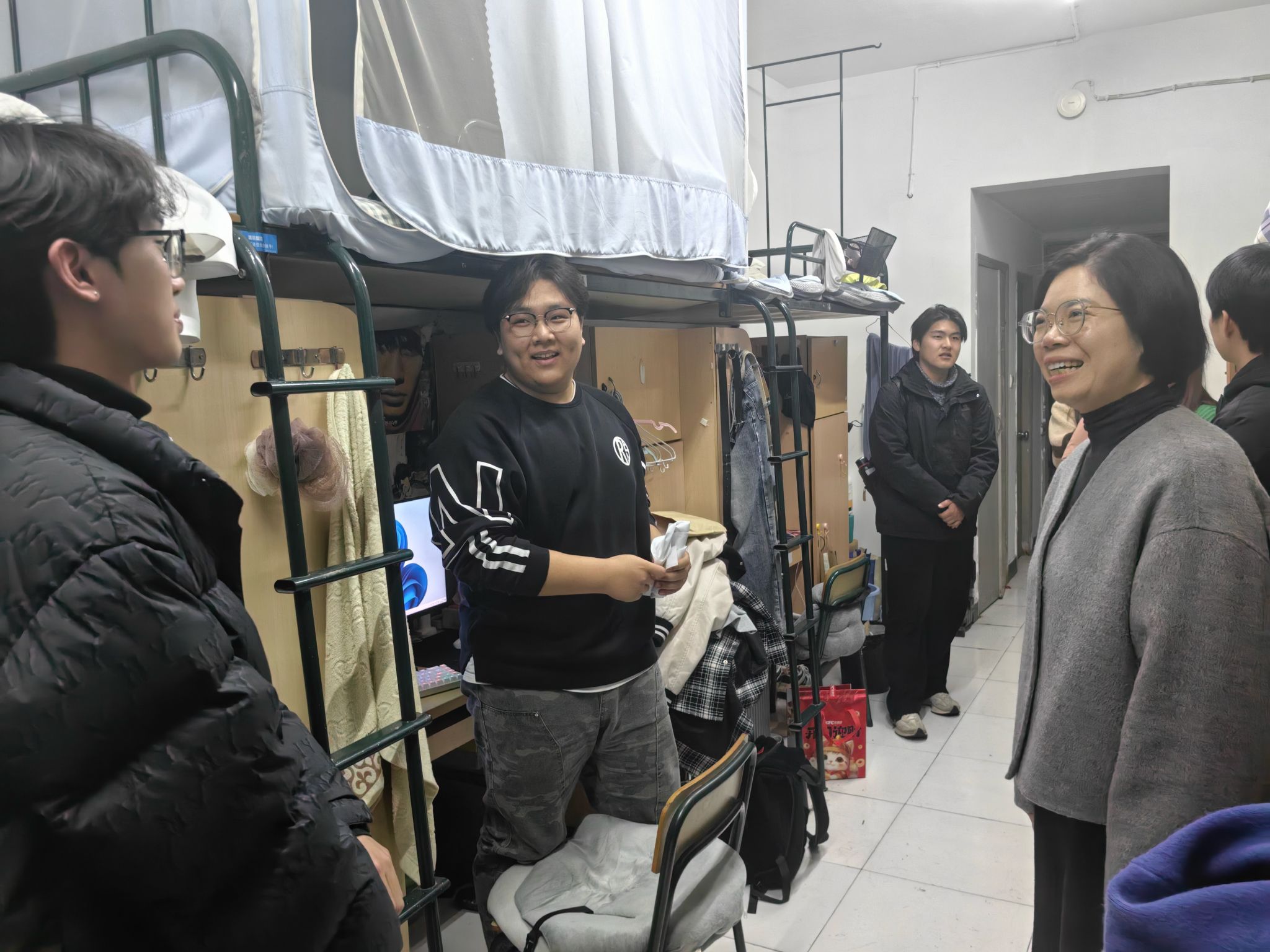 党委副书记林海红、学工办主任胡震鹏、辅导员曹清清、张凯和本研学生干部一起走进学生宿舍,开展了一场温暖而有意义的走访活动。