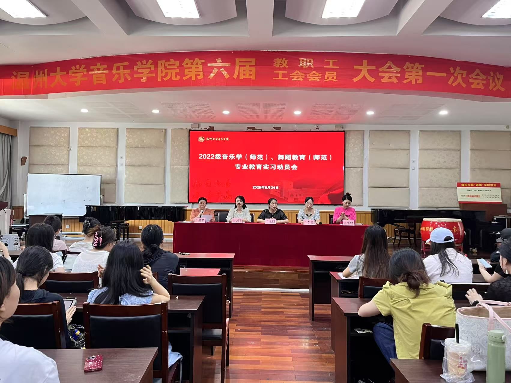 于2025年6月24日下午在音乐楼201学术报告厅开展了动员大会,教学副院长张潇潇、实习负责人李葳、李恒子、教学科科长成晓、学生科曹清清、以及2022级音乐学(师范)、舞蹈教育(师范)全体学生,会议由成晓主持。