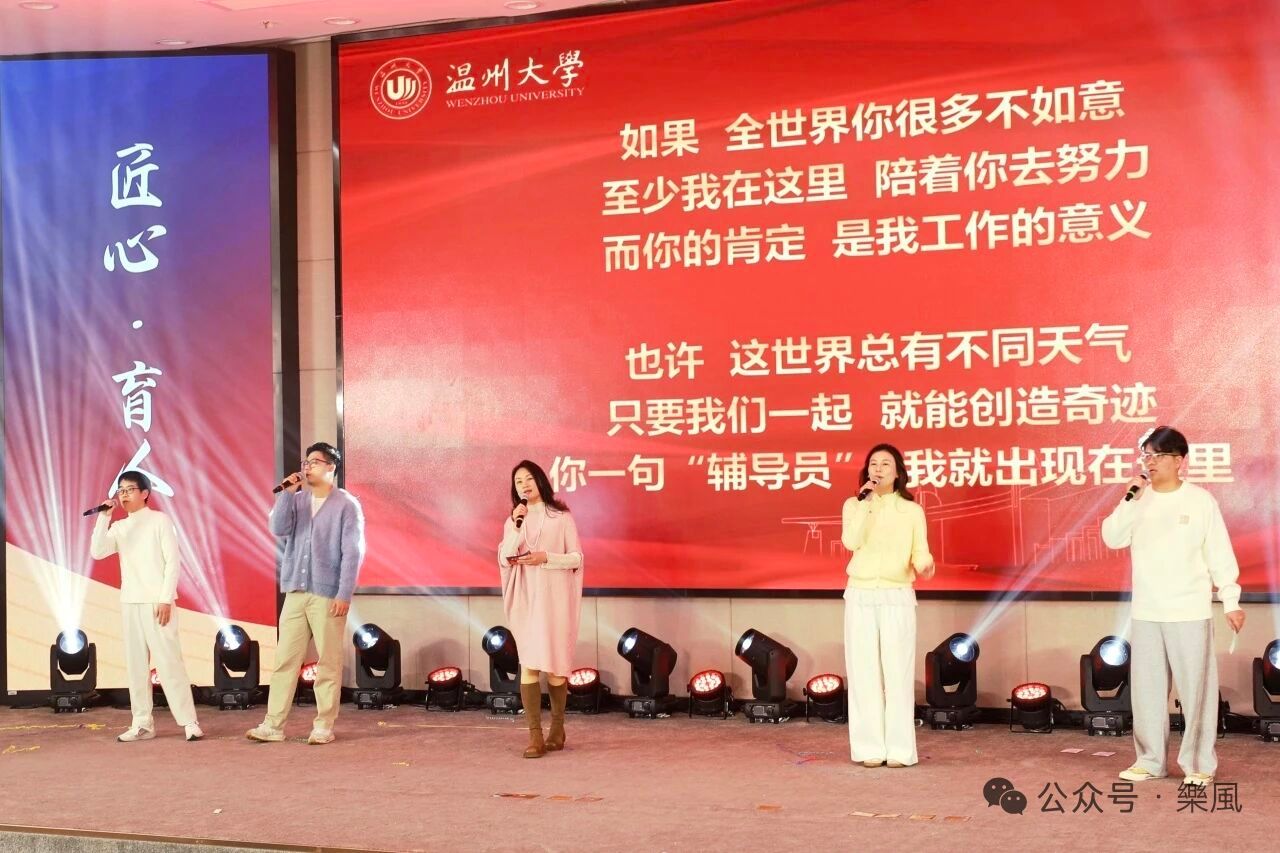 的辅导员代表相继登台,一展歌喉。当聚光灯亮起,平日伏案耕耘、奔走于校园各处的辅导员们化身舞台上的歌者,用歌声诉说育人路上的点滴。他们以改编的歌词讲述查寝谈心、守护成长的日常,借动人的旋律传递“立德树人”的坚定信仰。这不仅是才艺的展示,更是讲台之外的深情倾诉——舞台上的“通知达人”“应急先锋”“成长向导”,共同勾勒出辅导员群体的鲜活形象,汇聚成温大育人画卷中温暖而明亮的风景。