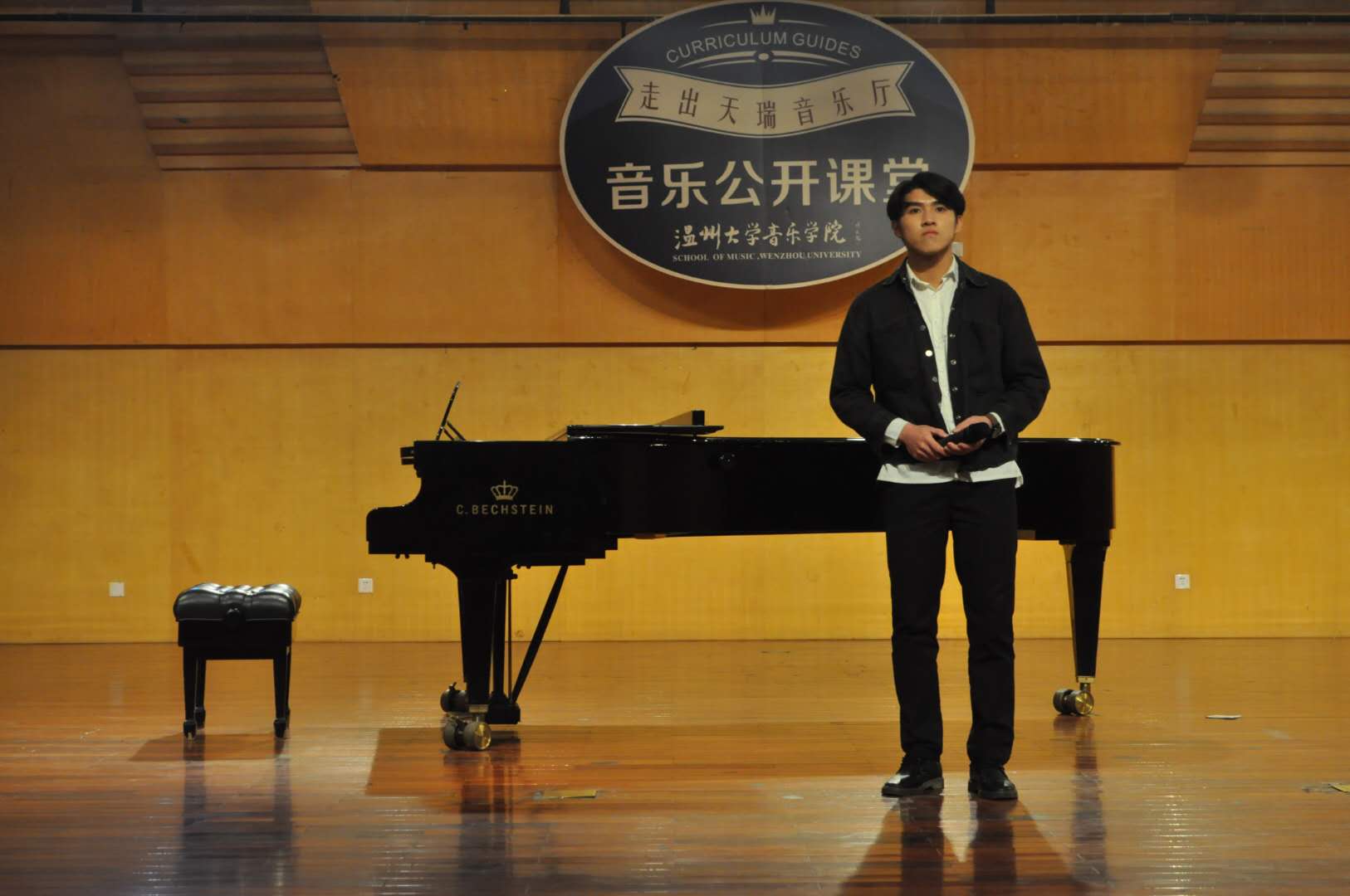 。并向听讲的学生们关于音乐鉴赏的一些礼仪和关于形体站姿方面的小知识。还亲自为场下的同学演唱了云南、山西等民歌。介绍了歌唱的四种唱法:通俗、民族、美声和原生态。使场下氛围活跃起来。接下来便是激动人心的时刻了,首先,来自16级数信研究生陈垚同学为我们带来《爱的的箴言》与《暗香》 。厚实的嗓音加上略微伤感的旋律萦绕在整个音乐厅,台风大方得体,赢得了台下同学的喝彩。而由时时彩