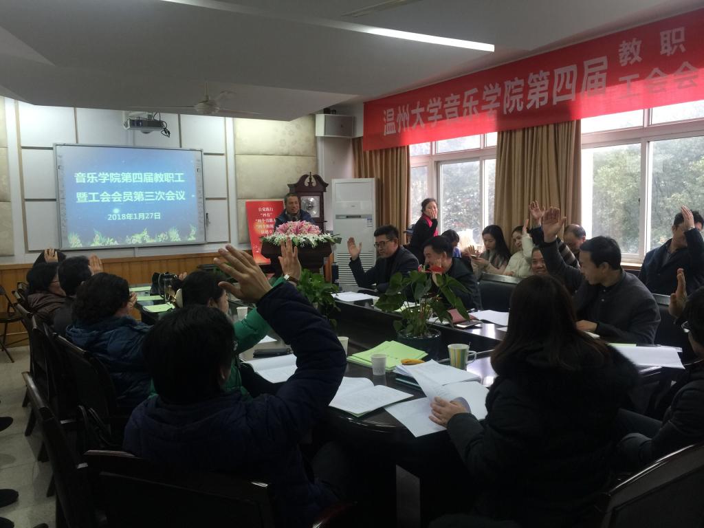 2018年1月27日下午1:30,我院第四届教职工暨工会会员大会第三次会议在音乐楼207会议室召开。会议共分为四个议程:赵玉卿同志作《时时彩