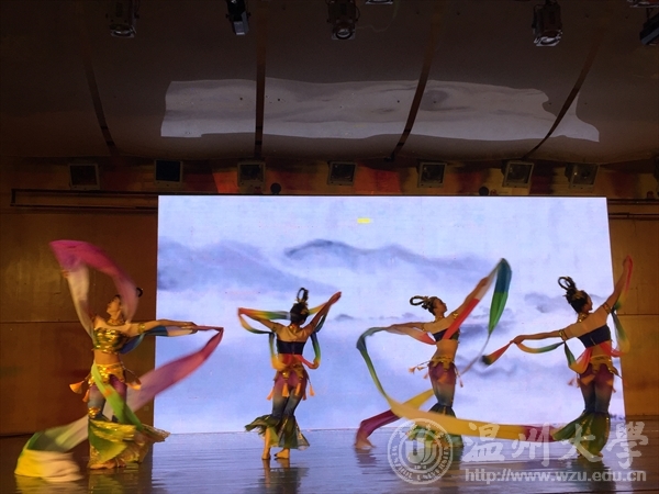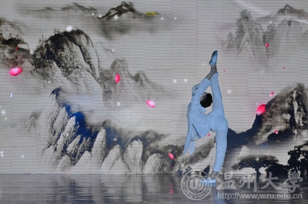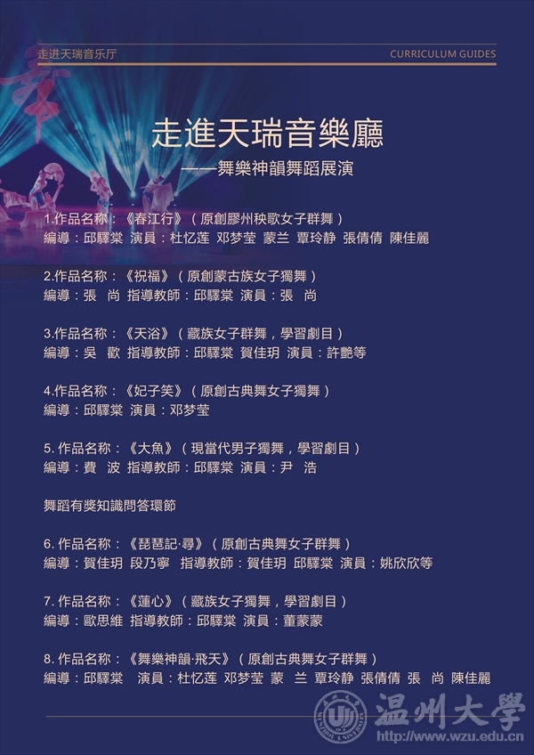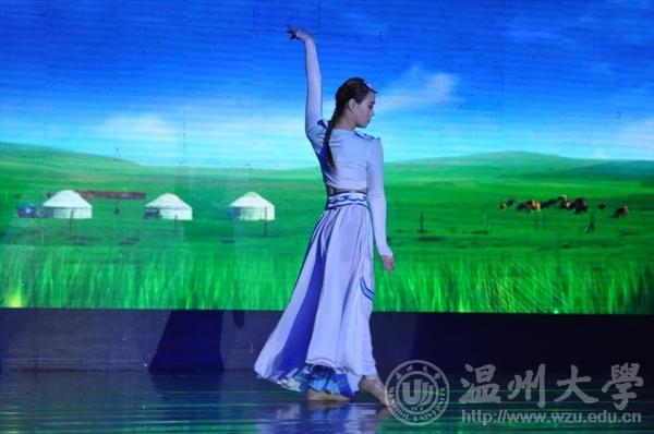 首先由邱老师编导由五位女同学带来的《春江行》,该作品以女子五人舞的形式,通过胶州秧歌身姿与扇子的翩然结合以及扇子的各种变化,营造出优美深邃的意境,同是营造出一种壮观华丽的场面,达到使观众兴趣盎然,耳目一新的欣赏目的。创造性地展示了胶州秧歌的淳朴大方,开朗清新。其次,是由张尚同学带来的原创蒙古族女子独舞《祝福》,此舞结合了产生于蒙古族民间的蒙古族舞蹈与顶碗舞,形式新颖、动作优美、气质高雅、风格独特。接着,是由邱老师的原创作品《妃子笑》由邓梦莹同学演绎,利用妃子的典故,表现了古代妃子的雍容华贵与典雅。中场舞蹈知识问答环节观众们凭借着自己的知识积累各个全神贯注,争先恐后的回答着问题。除此之外,藏族女子群舞《天浴》描绘了一个传说。在藏民眼里,这是平安、幸福的热水泉,灵魂与生命交汇的地方;原创古典舞女子群舞《琵琶记•寻》讲述了蔡伯喈与赵五娘跌宕起伏的爱情故事;现当代男子独舞《大鱼》讲述了在另一个世界里,所有人都是鱼。出生的时候就是他们从海的此岸出发,生命横越大海,有时相遇,有时分开......死的时候,他们便到了彼岸,各去各的世界。还有藏族女子独舞《莲心》、原创古典女子群舞《舞乐神韵•飞天》的精彩演绎。