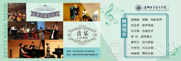 的师生精心准备了7场公开音乐课堂,将在2018年元月之前陆续推出。以讲演音乐会举办日期先后为序,主要包括:许天鸣老师的“走近音乐”、杨欣老师的“胡琴魅力”、叶文辉老师的“合唱艺术”、刘玉亭老师的“歌声悠扬”、董凌凡老师的“丝竹雅韵”、王晓佳老师的“林籁泉音”、邱驿棠老师的“舞乐神韵”。