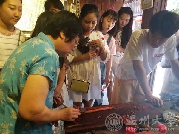 在活动正式开始之前,我们的队员们就各自分配了各自的任务,有的负责摄影,有的负责采访的记录,明确的分工才能做到最高的效率。短短的十几天,我们分别拜访了剪纸基地,百年手工秤店铺,传统海苔饼工艺基地,鲁迅展馆,和张伯端研究所等地方。从达到文津别院剪纸基地拿起手工剪刀的那一刻开始,我们就真正融入了这个小城。先是观看了张秀娟老师的宣传片,便在老师的指点下拿起了红色的纸样板,戳破第一个小口子,似乎手都是抖的,时间仿佛静止,耳边只有细细沿着样板裁剪的声音。一两个小时的度过,就像转瞬即逝,原来真正投入一项手工艺,时间也会忘却了。张秀娟老师在接受我们采访的时候,告诉我们她接下来的目标是将剪纸技艺传承给更多的人,也许可以传向世界。这一伟大的目标让我们震撼更是让我们佩服,有的老手艺已经不断发展与新时代接轨,也有的令我们叹息不已。