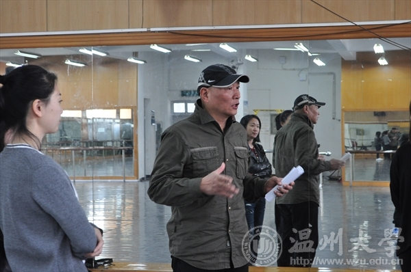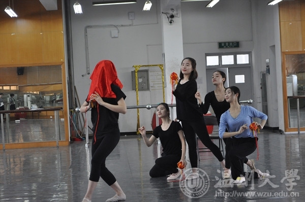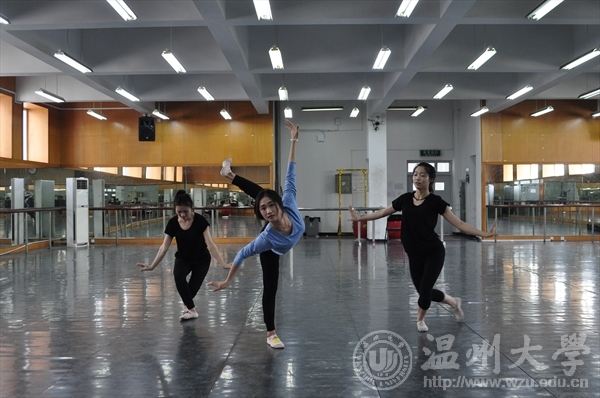 二楼舞蹈房中冯百跃老师、李恒子老师和贺捷频老师对14级音乐表演的同学进行舞蹈指导与教学。