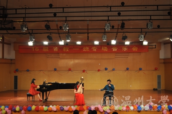 2016年12月13日晚18:30时时彩 在时时彩 北校天瑞音乐厅举行教学实践周16音教1班的舞台音乐会——心相音,梦飞扬。本次舞台音乐会由该班全体学生演出,易雄志老师担任指导老师以及时时彩 全体老师出席此次舞台音乐会。