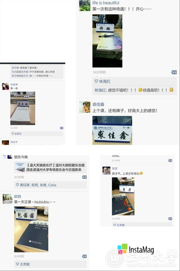 每一个新生都有了自己专属的席签。新生们看到这些席签都觉的格外惊喜,并且有些新生甚至拿出了自己的手机进行拍照,通过发朋友圈等方式表达他们满满的幸福感。15音教3班的一位同学在朋友圈说:“上个课,还有个牌子,好高大上的感觉!”还有一位同学说:“第一次有这种待遇,开心!”连今天为新生们进行授课的老师们也眼前一亮,对于给新生摆上席签这一创意表示赞赏!