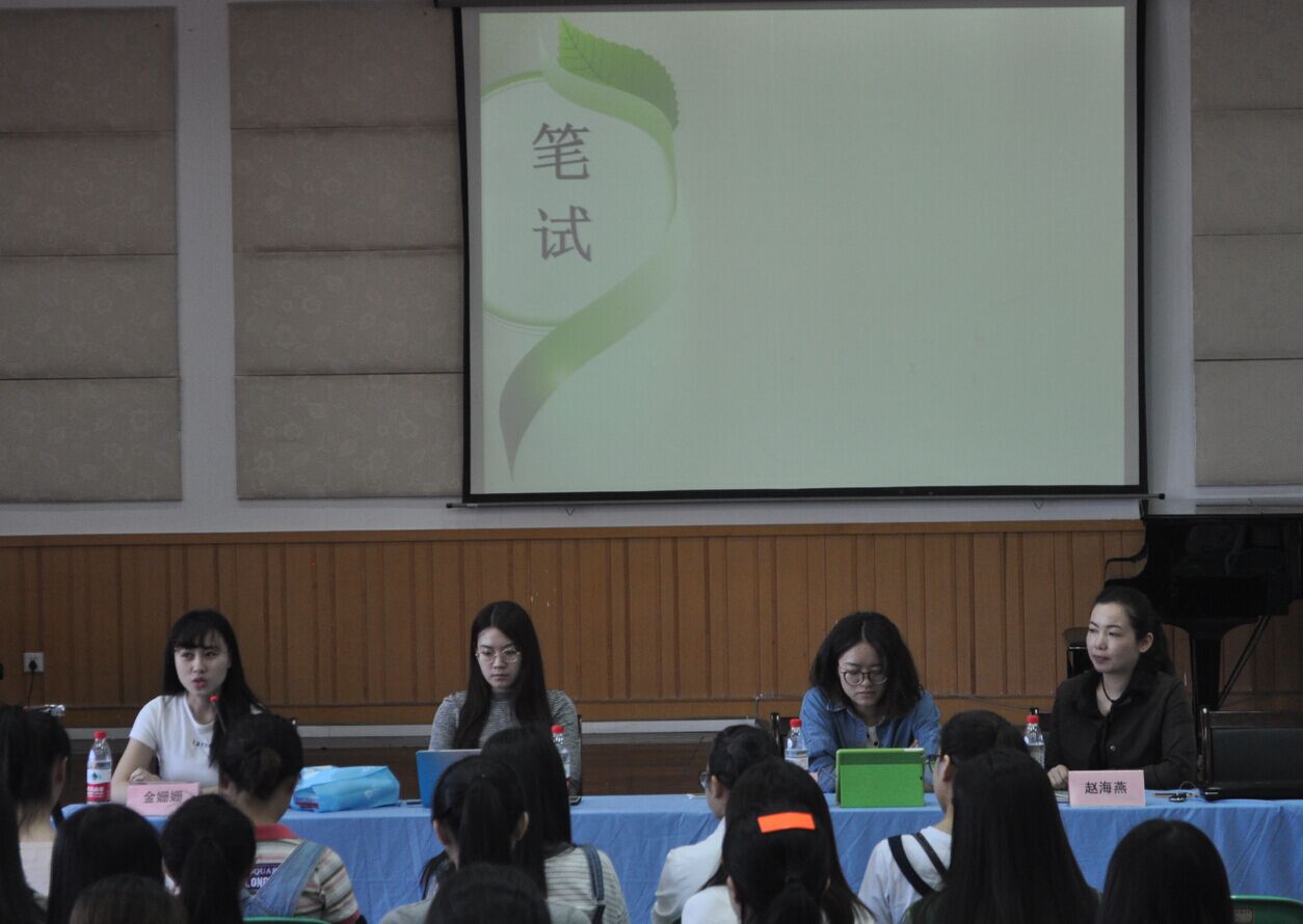 ,现就职于瓦市小学,担任校合唱团指导师。接着由金姗姗向大家介绍笔试部分,她向大家推荐了几本书:《音乐知识应考速成》、《教师招聘考试》、《浙江省教师》等。向大家分享了她当年考试时候的学习方法。要合理的制定计划。第一轮:1.划重点(书上):人物作品等。2.做配套单元题。3.整理(笔记本)。第二轮:做真题。一天至少要做3份真题模拟卷(要背答案)并且每天要复习错题,整理好错题集。第三轮:回归教材,复习做过的试卷、整理错题。然后,由李芸芸介绍考编面试的技巧。面试的形式分为说课和试讲。说课,根据申请人的学科选定内容,在规定时间到制定地点集中,通过抽签方式确定说课课题,并在封闭情况下,不借助参考资料独立设计出教学方案,在指定的备课教师做好说课准备,时间为60分钟,说课原则上15分钟内。说课也要有一定的技巧,各位领导、老师们,你们好!今天我要进行说课的主题是……。下面,我对本主题进行分析。一、说教材的地位和作用。二、说教学目标。三、说教学的重点和难点。四、说教法。、五、说学法。六、说教学过程。在试讲的时候,要有信心,讲课要有激情,如果抑扬不足,起码声音要大,讲话的语速不要太快,如果拿捏不好,可以多多演练。在试讲前要做好充足的准备,把要讲的内容的相关背景等结合起来,让背景知识在吸引人的同时把人引导到课本的内容上来。其实最重要的,是要关注自己当地的教育网站,关注招考的信息,以免错过考试。最后,由张诗嘉老师向我们介绍教师考编的流程。1.报名 2.资格审核 3.领取准考证 4.参加笔试 5.领取面试转考证 6.参加面试 7.体检 8.公示 9.上岗。报名要多关注所在地教育局的网站,每年教师招聘的时间,网站上会出示公告,根据公告中的报名地点,时间,以及程序等,来判断你是否参加入编考试。