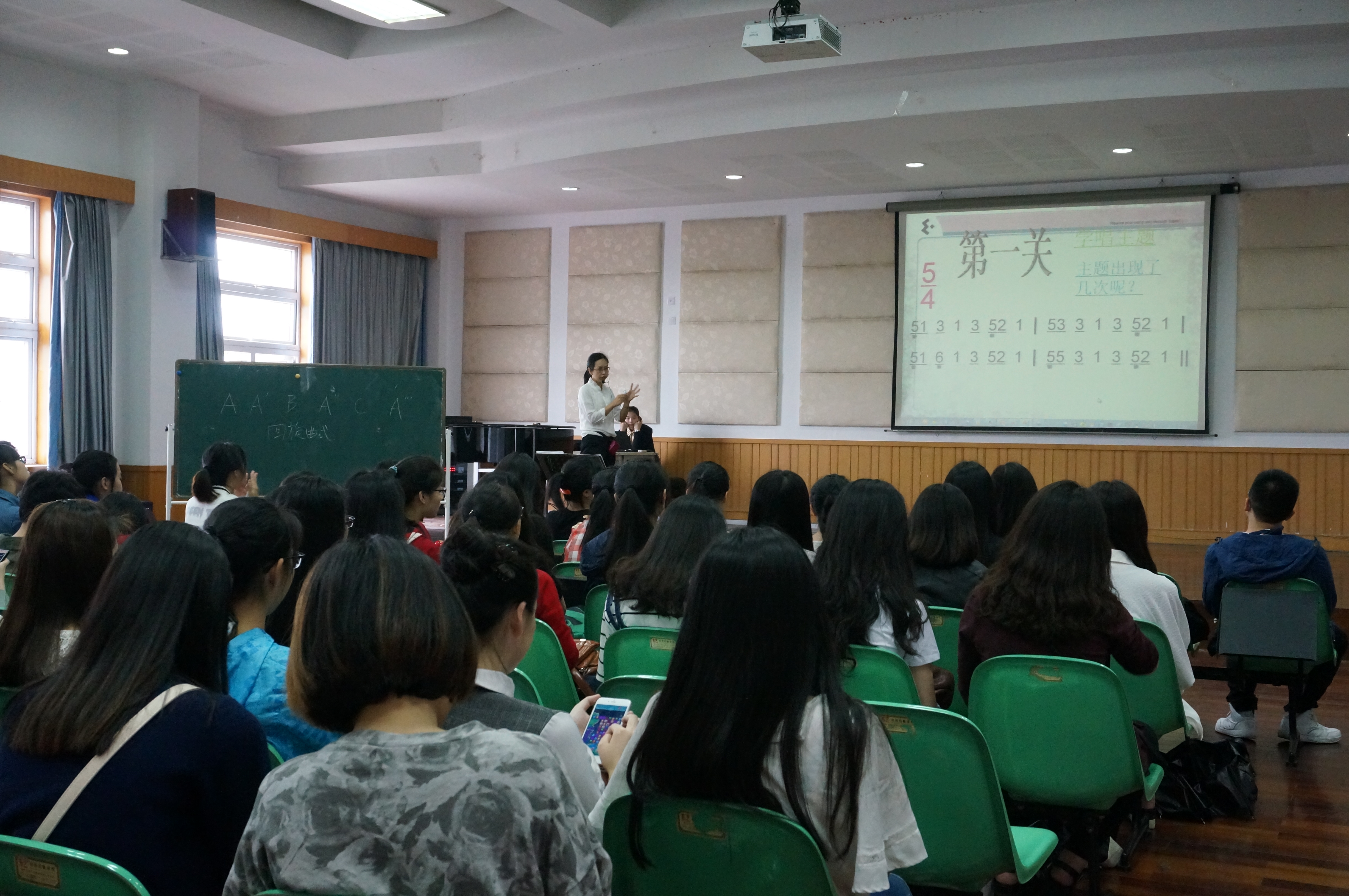 2015年5月11日,实践周第一天,时时彩 理论教研室李葳老师的公开课于当天上午9点在音乐楼201学术报告厅举行。李老师以《欣赏教学方法探索》为题,提出并实践了她在教学实践中总结出来的十六种欣赏教学方法。并组织12、13级音教专业的学生,参与到生动的“律动”教学之中。