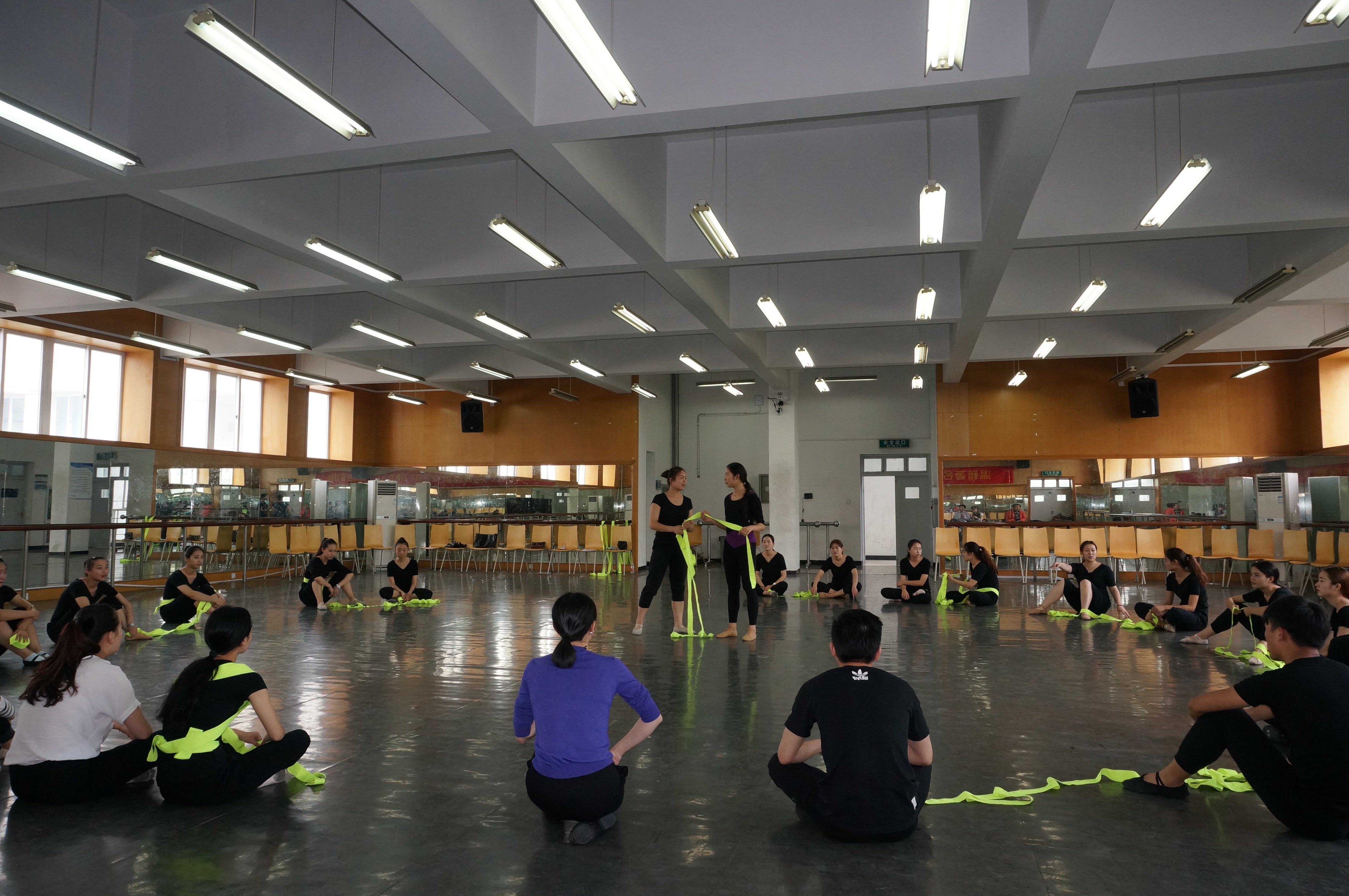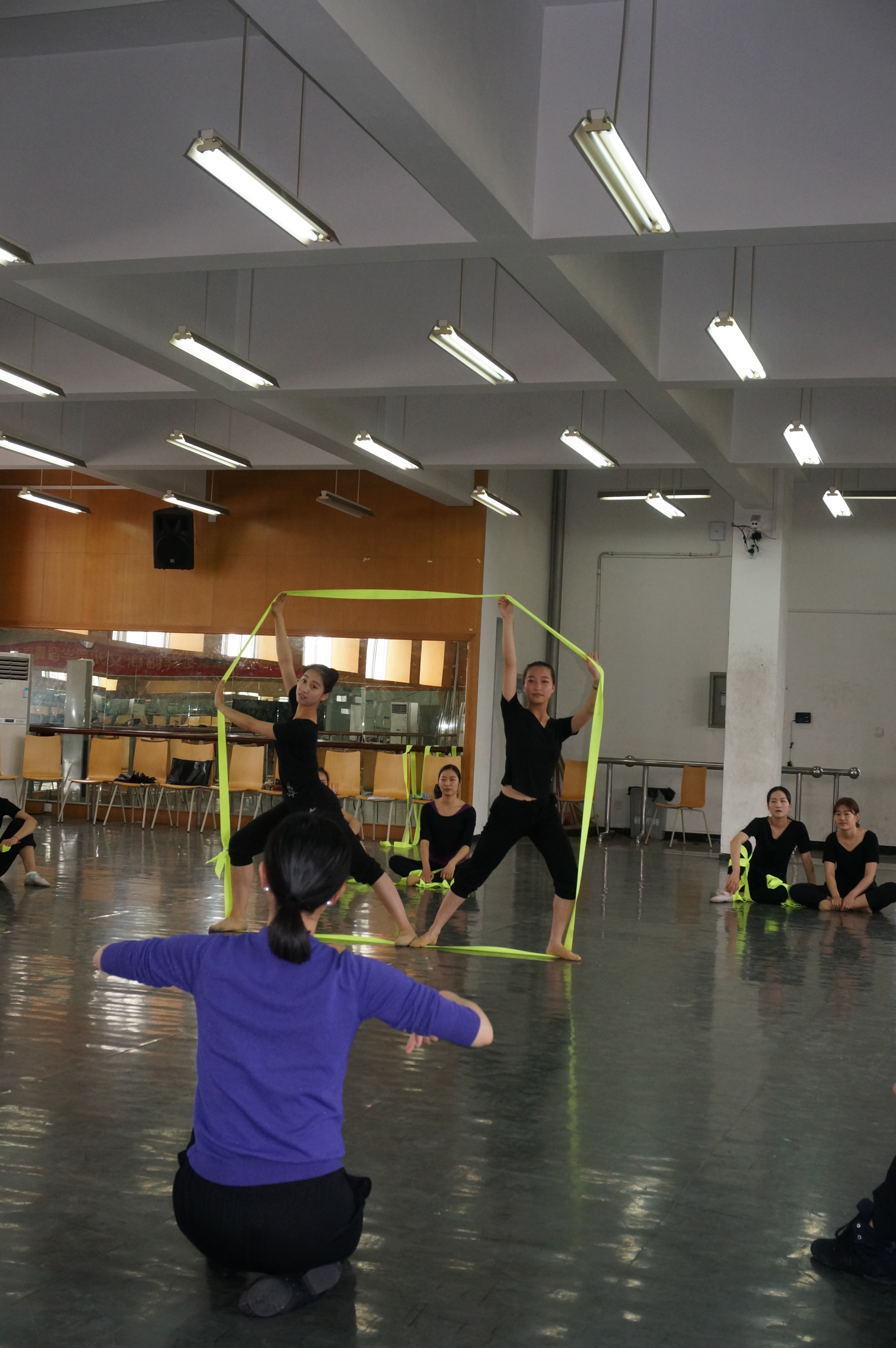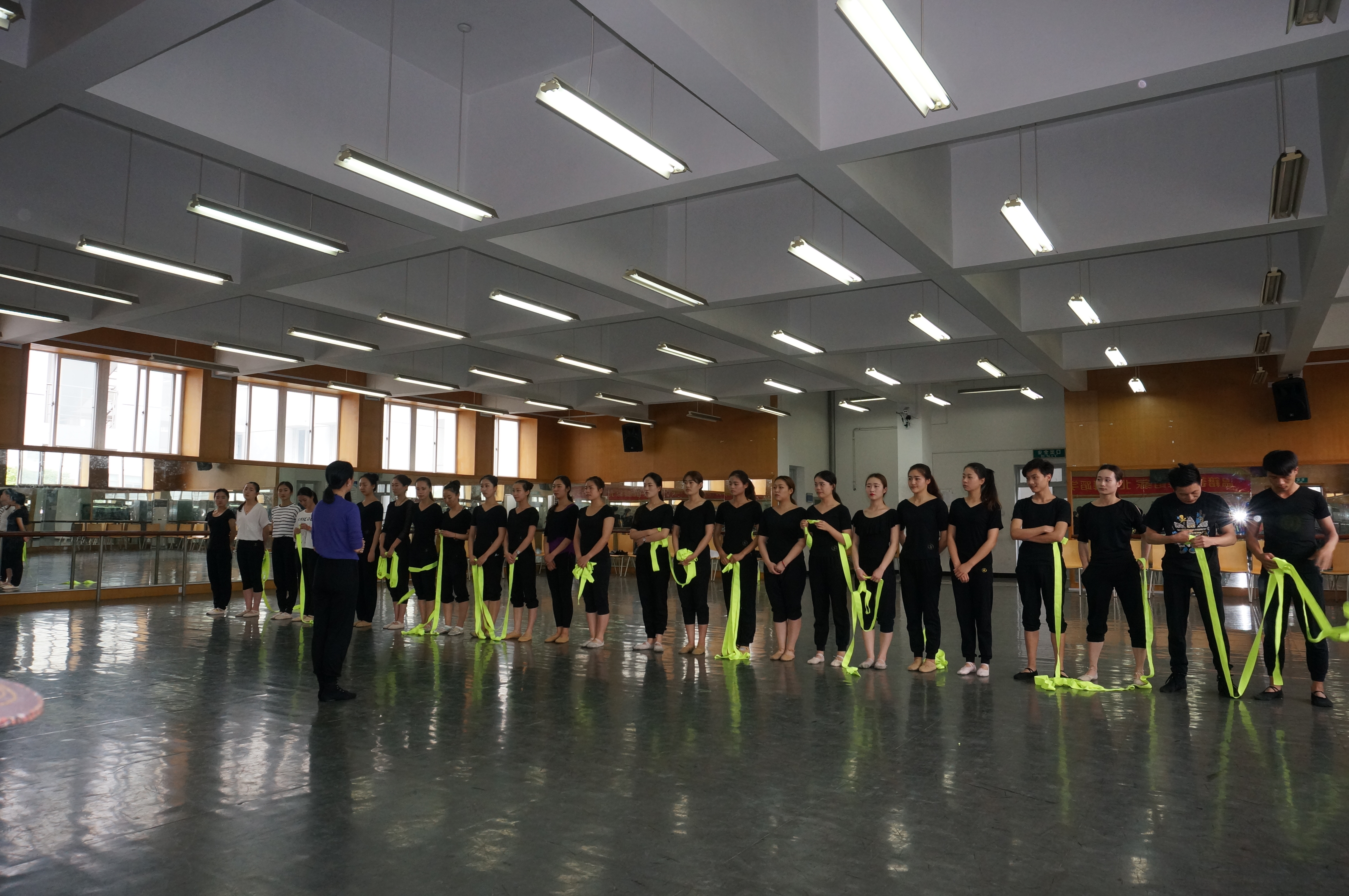 2015年5月11日14:00分,舞蹈教研室贺捷频老师的《舞蹈》公开课,在音乐楼二楼舞蹈厅举行。大家的眼球被每个舞者腰间系着的黄丝带所吸引——直到贺老师说明授课“规则”。这是一堂很有创意的舞蹈课。13、14级舞蹈方向的学生,紧随贺老师的引导,手中的黄丝带伴着黑色练功服,不断出新、逐渐活了起来。霎时,一个个黑黄两色的俊男、美女伴着音乐,游走于舞蹈大厅,跳动的青春活力处处奔放。