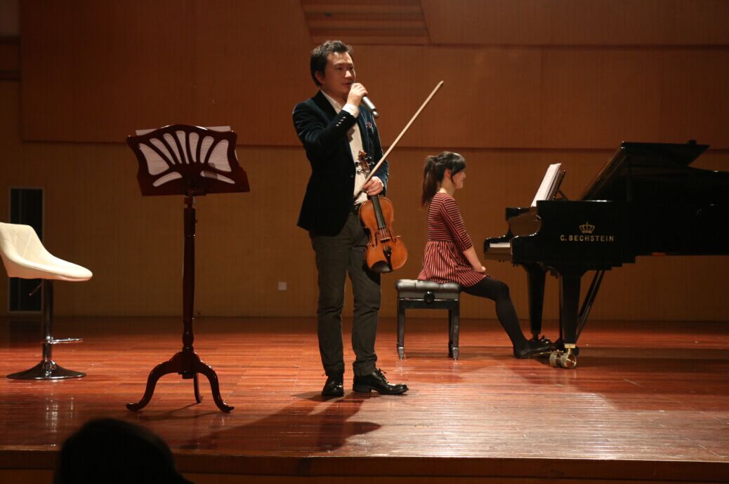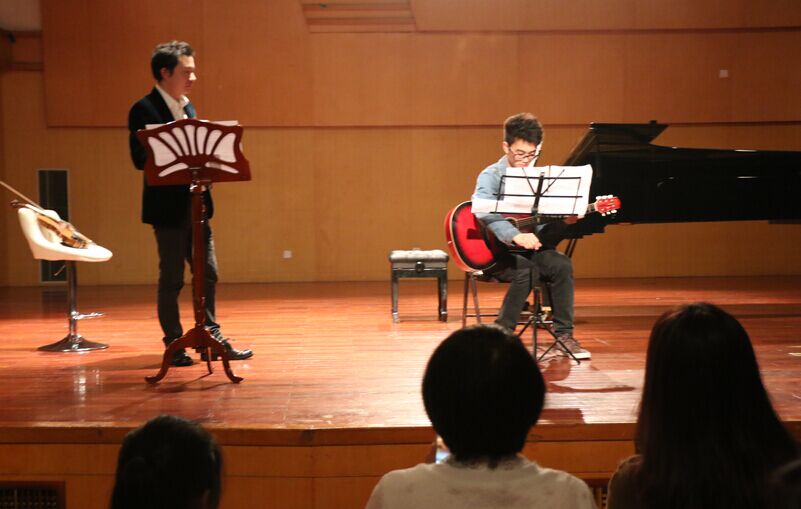 大一学生孔逸蕴带来的吉他弹奏,他弹奏了电影《断背山》的背景音乐。不同的乐器演奏为音乐会带来新的元素,也改变往日平时大家对音乐的理解。紧接着,胡老师为我们带来电影《闻香识女人》中的音乐,这首Tango风格的曲子,曲式为ABAB,首段呈现慵懒幽默的口吻,进入到B段转小调,转而呈现激情的感觉,接着又转回大调。由小提琴和口琴作对位和声的表现。两个部分那种前后矛盾而又错落有致的风格充分的展现了探戈舞中两人配合的默契。胡锦超老师的高超琴技与他夫人的默契配合完美的 演绎了这首曲子。