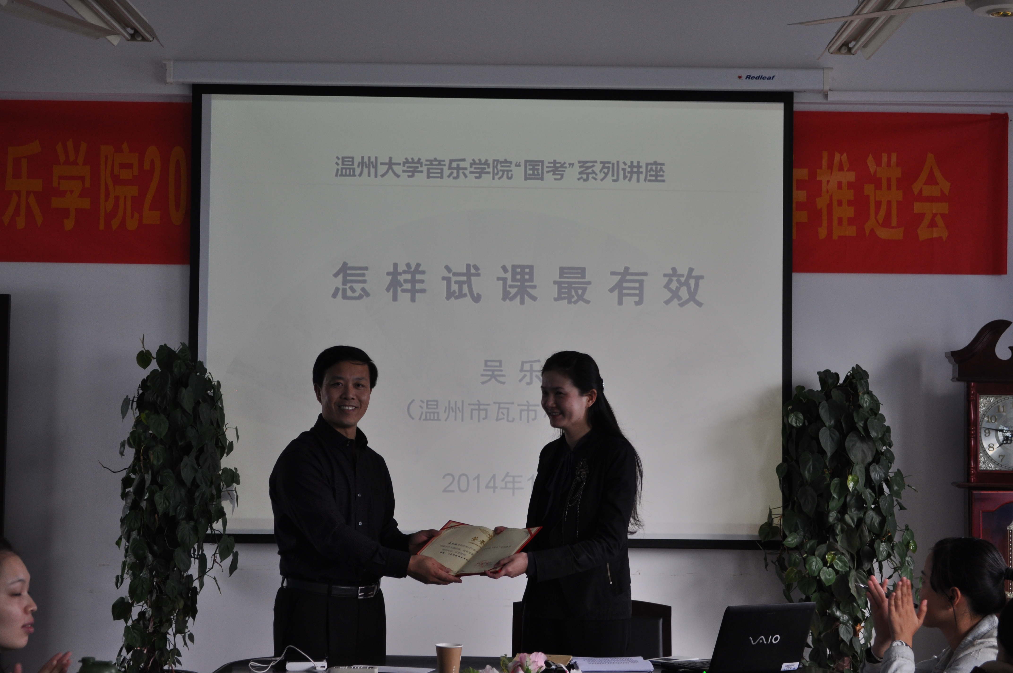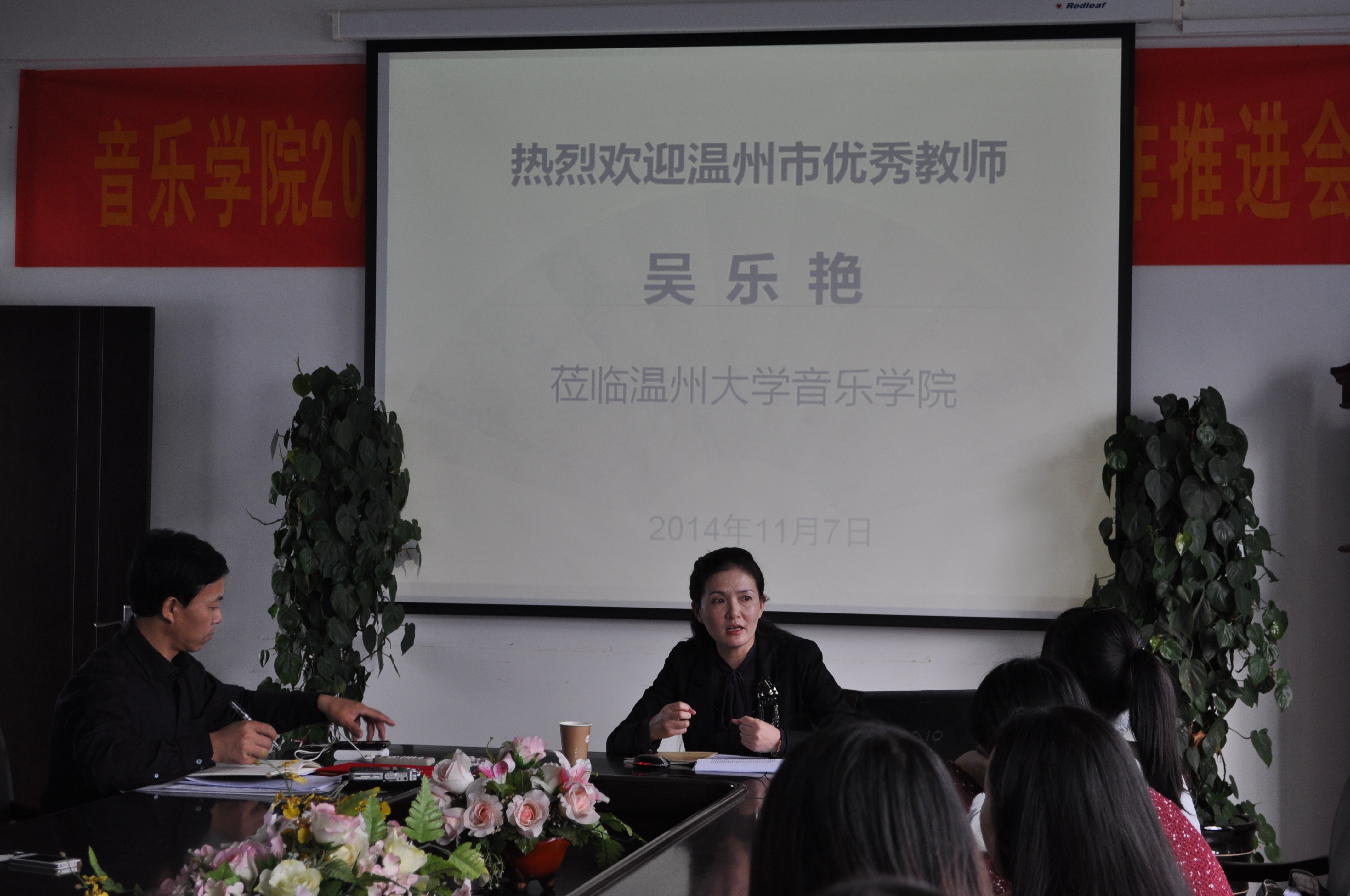 2014年11月7日下午,温州市优秀教师、教坛新秀,瓦市小学音乐教师吴乐艳莅临时时彩 ,指点学生“试课”的有效途径。时时彩 教学督导王守琢老师与时时彩 的同学们一起参与了交流。该活动由王文韬副院长主持。 吴乐艳老师就学生“国考”、“考编”之音乐教师国家资格考试过程中的试课环节,给予音乐学、音乐表演专业的学生有益指导。她建议应考的同学,一定要熟悉现行的各个版本的音乐教材,同时要打好“自弹自唱”的技术难关。