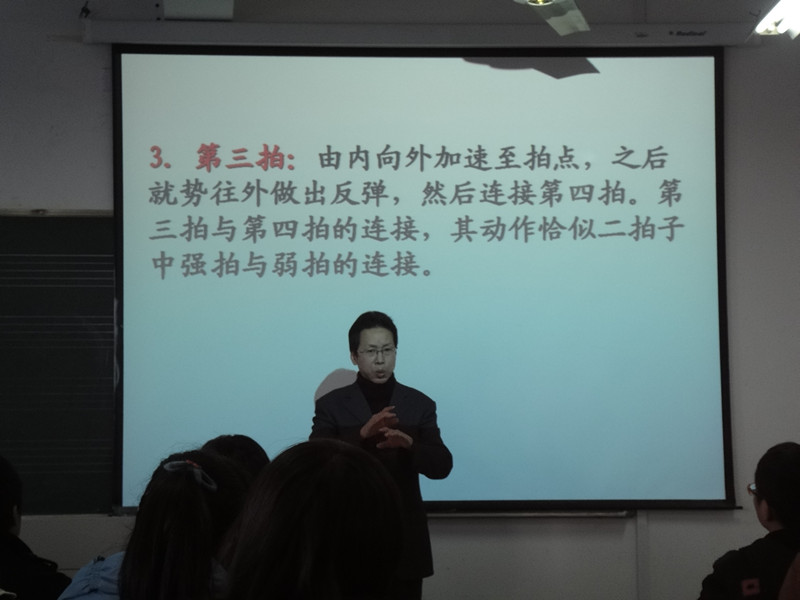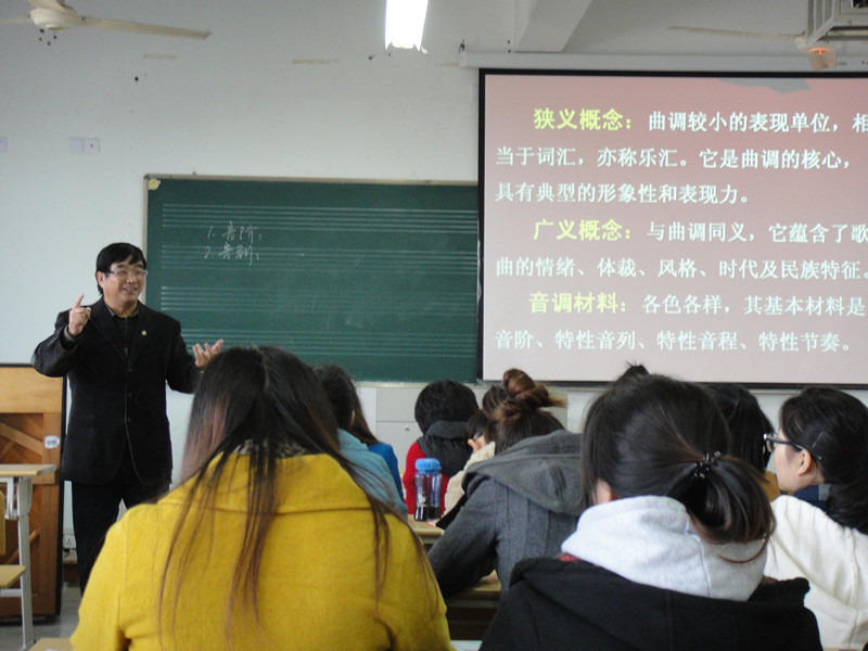 “教学名师”陈其射教授和乔志亮教授,带头为青年教师们开出了“音乐名师课堂”教学示范课。陈教授的《歌曲作法》生动活泼,其敬业精神、灵活多变的课堂教学方式,以及先生全身心投入的授课激情,令师生们难忘。乔教授的《合唱与指挥》集中示范了合唱名作“半个月亮爬上来”,课堂效果明显,乔教授的教学一丝不苟,先生视课堂如战场之教学态度,及其准确到位的指挥肢体语言,给师生们留下了深刻印象。