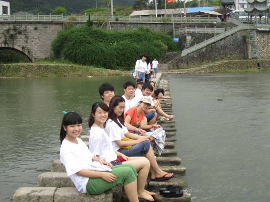 长方型的石头碇埠像极了钢琴的琴键,被当地人起了一个美轮美奂的名字“琴桥”。蓝天白云下,队员们在碇埠上开心的玩水嬉戏,在碇石上小憩拍照留念,体验着碇埠的独特风情,感受着泰顺人与自然的和谐。