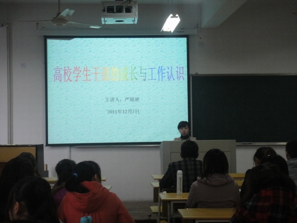 团委邀请了校团委严晓秋老师做了一个关于“高校学生干部的成长与工作认识”的讲座。严晓秋老师围绕着学生干部的角色定位,能力要求和工作路线,结合自己的学生干部的经历,与大家分享了一名出色学生干部的成长历程。严老师说,工作要源于自己的兴趣,要自愿去做,各类学习工作要根据自己的情况进行调节等等严老师强调,作为学生干部要有创新意识,强化责任意识、软化功利性,强化沟通意识,减少冲突。此外,严晓秋老师还和学生干部们展开了有关学生干部工作过程中遇到的问题及解决方法的讨论,同学们积极参与讨论并从中收获很多。讲座的最后,严老师还为大家提出的问题进行了一一解决。