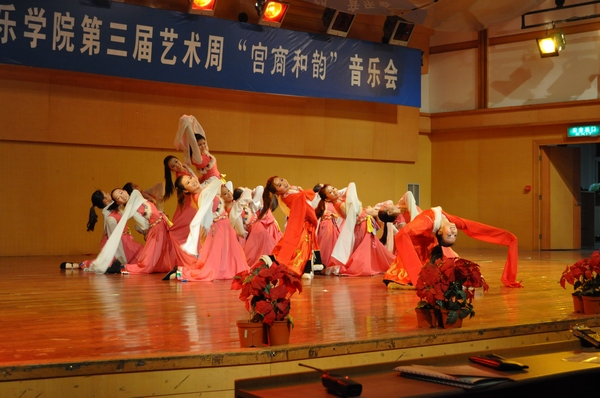 音乐会节目精彩纷呈,为大家带来了一场视听盛宴。有女声合唱、女生独唱、钢琴独奏、古筝三重奏、舞蹈、民乐合奏、双钢琴协奏、男生四重唱等10个各具特色的节目,晚会高潮迭起,此起彼伏。开场民乐团合奏《龙腾虎跃》欢快的旋律一下又把观众的情绪调动起来,引来观众阵阵掌声;古筝三重奏、钢琴独奏、双钢琴协奏等节目的演奏为同学们送上了一顿器乐盛宴,女声合唱团带来的《工尺谱游戏》、《樱花》带我们游览了音乐的街廊;男声四重唱《阿拉木汗》为整场晚会的气氛增添了不少色彩;舞蹈《竹二青,妹儿红》让人仿佛置身于舞者们之间,让人忍不住想起身共舞。藏族舞《望果》在各位舞者们的脚下,我们仿佛看到了一群藏族姑娘在跳跃在旋转,沉醉在优美的舞姿中。