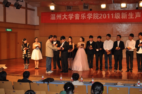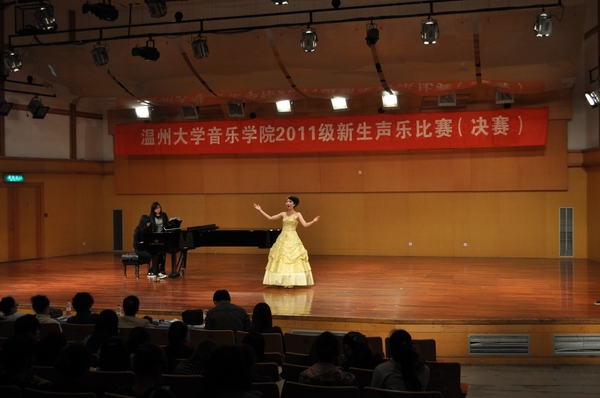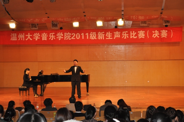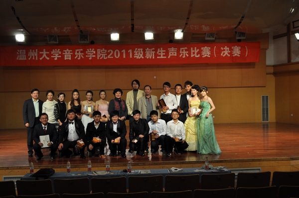 11月22日上午,2011级新生声乐比赛(决赛)在音乐厅隆重举行。15名同学经过选拔进入决赛。经过激烈的角逐,产生了一等奖一名,二等奖三名,三等奖5名,其余是优秀表演奖。11音本的孙海洲同学脱颖而出荣获一等奖。