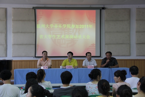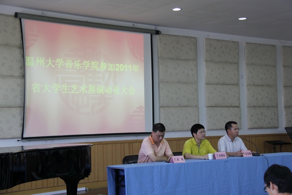 参加2011年省大学生艺术展演集训动员大会在音乐楼201举行。院党总支书记刘青松,副院长王志毅,学生科科长周帆,民乐团指导老师池玲珑、董凌凡,合唱团指导老师李兵、叶文辉,舞蹈指导老师冯百跃及参加艺术展演的有关学生出席了大会。大会由副院长王志毅老师主持。