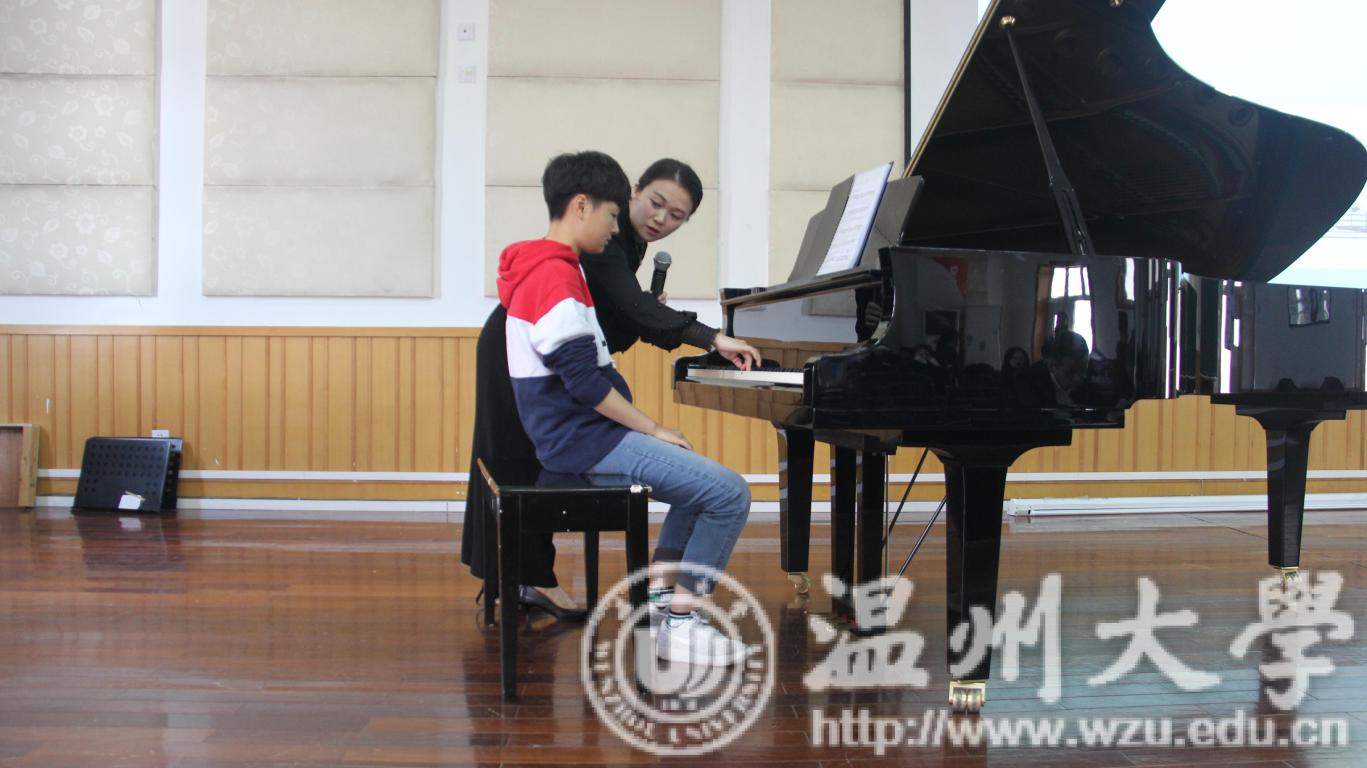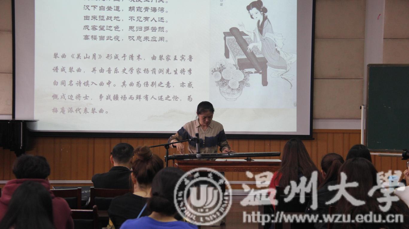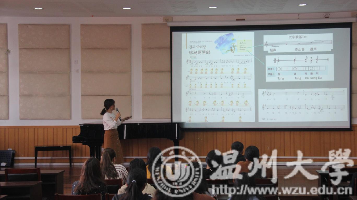 第一堂课,是张潇潇老师的"古琴课堂"。首先,张潇潇老师用幽默诙谐的方式为大家演示了影视剧中几个错误的古琴演奏片段。紧接着,张潇潇老师又列举了许多古琴的正确的演奏方式、派别以及乐曲的创作历史背景等,以此来告诉大家,每一门乐器都是一种文化,在学习乐器的过程中,不能只固守其表学习技巧,更重要的是了解乐器背后的历史文化。为了让大家能够更加真实的感受到古琴魅力,张潇潇老师为大家献奏乐曲——关山月。音韵朴实、自然,让大家沉寂在古风韵律之中,仿佛带大家穿越回古代,享受山水之间、自然之美。之后,张潇潇老师又为大家讲解了"减字谱"的演奏方法并为大家带来了乐曲片段——沧海一声笑。演奏完毕后,同学们跃跃欲试,张潇潇老师邀请学生上台,指导学生演奏古琴。第二堂课,是由钟芳芳老师带来的"茉莉花&阿里郎"。首先钟芳芳老师列出了两首歌曲的乐谱,让大家对两首歌曲有了一个初步了解。紧接着,钟芳芳老师先介绍了各地域不同版本的茉莉花,虽然各有差异,但却相互联系。这说明各地域文化百花齐放但都围绕在中华文化的主干周围。然后,钟芳芳老师又为大家讲解了歌曲——阿里郎,同学们在下面打节奏,钟芳芳老师在台上演唱。演唱完毕后,又为大家带来了阿里郎演唱的影视资料,切身体验阿里郎的魅力。第三堂课,是由陈露雯老师带来的"钢琴演奏中的点与线"。陈露雯老师邀请学生上台,并指导学生弹奏各种节奏型以及不同调式的音阶,在老师的精心指导下,学生弹奏地越来越熟练。在进行完音阶练习后,同学为大家弹奏了舒伯特即兴曲,老师对其演奏曲目进行了一番指导,之后同学再一次演奏,与之前的演奏感觉大不相同,有了明显进步。