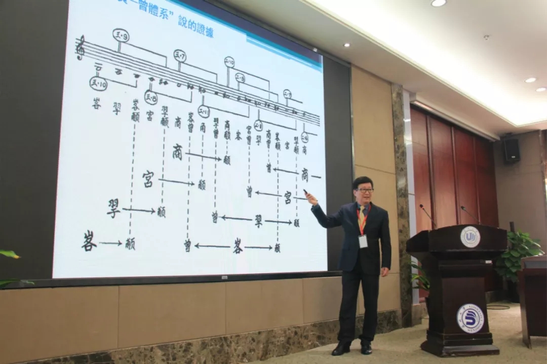 黄大同教授的发言题目为《曾侯乙编钟是否有“甫页—曾体系”之验证》。他首先阐述了黄翔鹏先生“甫页—曾体系”说,黄先生认为曾钟十二音的产生先以连续四五度相生关系产生宫、徵、商、羽4个基础音,再由这4个音分别向上大三度产生4个甫页音(甫页即角),以及向下大三度产生4个曾音。黄大同教授表示黄翔鹏先生的这一观点是当今学术界公认的对曾钟十二音生成形态的权威解读,并作为一项重要成就在众多教材、论著中得到传播与应用。但他提出了自己的不同见解,并用中层三组低起四钟, 衔接中层二组低起五钟列为图式进行了阐述论证,认为“甫页—曾体系”之说,仅仅是由线索触发灵感而产生的、属于主观意识的一种“大胆假设”,在曾侯乙编钟上,没有任何真实证据能够证明其存在。对曾钟有没有“甫页—曾体系”十二音的探讨,必须要用形式逻辑的思维方法,以及用客观真实的事实来推断的证据方法得出认识。