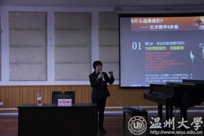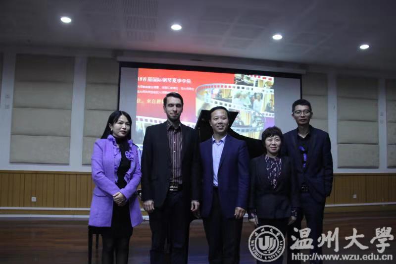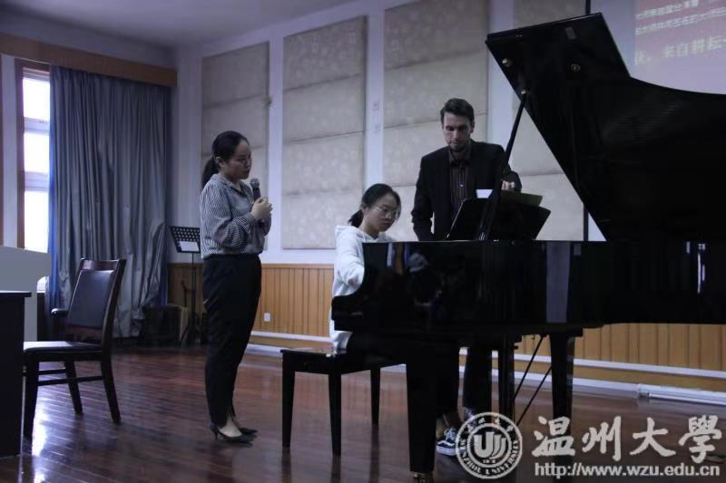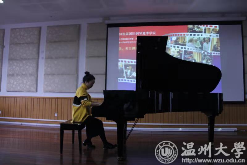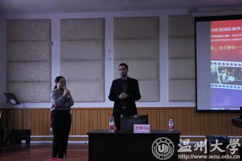 首先,由艺术留学广场刘董事长发表了讲话,介绍了艺术留学广场原汁原味的古典音乐,誉称艺术留学广场为艺术界的黄埔军校。刘董事长重点介绍了留学注意的各种事项,为广大温大学子提供了广阔的留学平台。紧接着,帅气与才能具备的马切伊教授用中文的方式与师生打招呼,全场气氛热闹活跃。首先是由张冰凌同学演奏的C.SAINT-SAENS Op.111 No.6 toccata ,马切伊教授通过对落键的强弱进行了详细的讲解,明确了精准的概念。接着是由王乐乐 同学演奏的Chopin Ballade No. 2 in F Major, Op. 38,马切伊教授点出速度与三连音的准确,并亲自演奏,让学生更加深切地感受到细节。紧接着是由林亦津同学演奏的Granados 12 Spanish Dance Op和李彦同学演奏的 Chopin: Scherzo No.2 in B flat minor, Op.31 ,流畅演奏后,马切伊教授亲自上台讲解,特别提出对曲谱上的所有单词意思要了解透彻,并点出踏板的适用句式。最后是由李瑱瑒同学演奏的 Rachmaninoff :Etudes Tableaux Op.33 No.9 、及贾佳琪同学演奏的 Edvard Grieg:Sonate in E Minor Op.7—Allegro 。马切伊教授分别做出了详细的点评,马切伊教授的讲解和亲身演奏的结合让在场的师生受益匪浅。