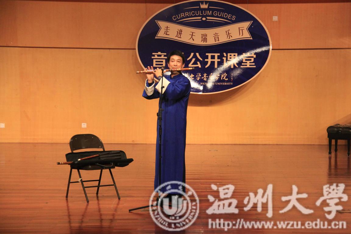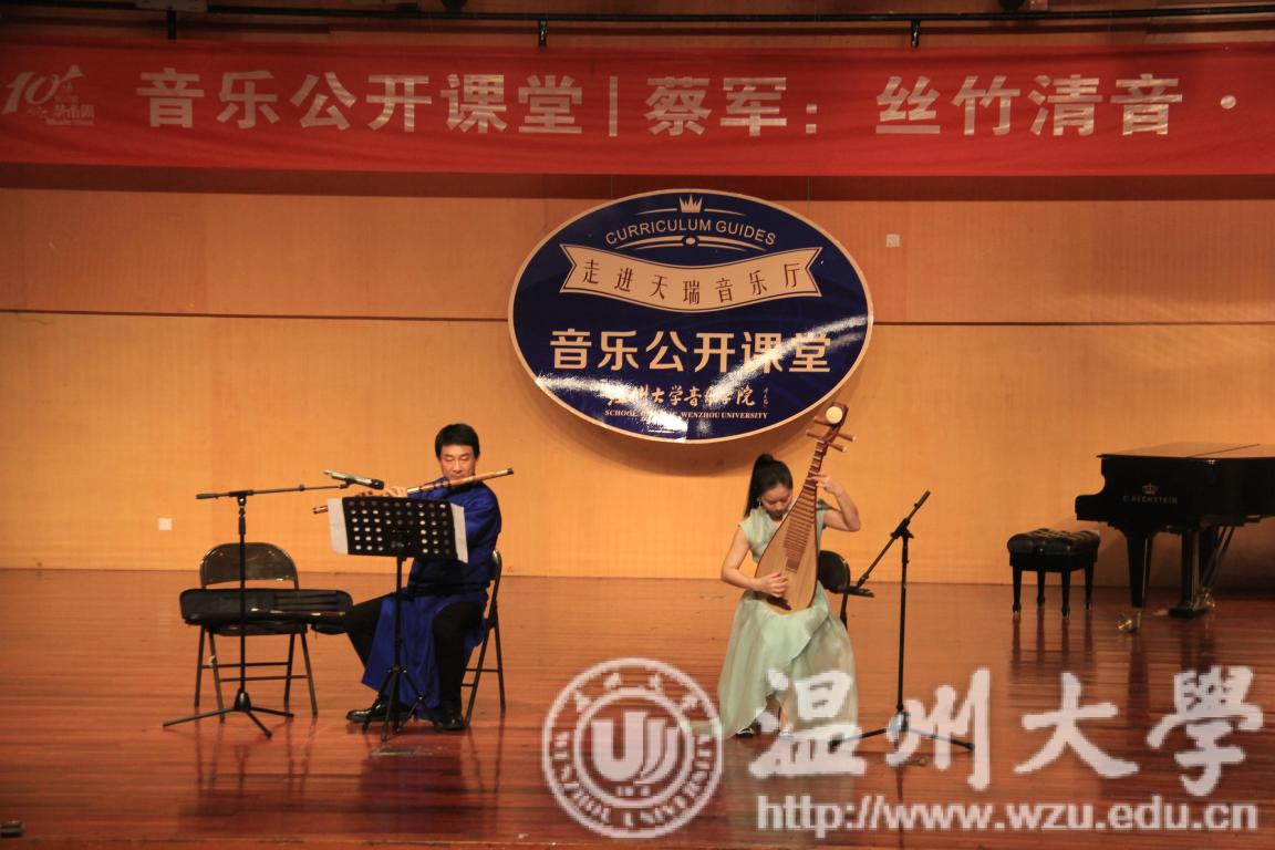 本场讲演音乐会首先向我们介绍了竹笛南北派曲笛与梆笛。随后,赵雷教授吹奏一曲,那嘹亮的音色、动听的旋律、丰富而纯熟的演奏技巧塑造了鲜明、朴实的音乐形象。接下来,主讲人蔡军副教授与赵雷教授合奏一曲,琵琶与竹笛的相撞,鲜明地表现出亲人依依惜别后又相逢时的喜悦心情,可从中感受到亲人间那种浓烈朴实的形场景以及重逢后感人至深的热闹场面。紧接着,主讲人蔡军教授为我们弹奏一曲《十面埋伏》,仿佛让人回到了冷兵器时代的那种纷争,战乱的时代,让人扼腕叹息。最后,古筝与琵琶的合奏更是令人神往,从听到的那一刻起,该曲就把观众带入到一种凄清婉转的情绪里,流连忘返。