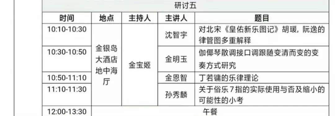釜山大学孙秀麟的发言题目是《关于俗乐7指的实际使用与否及缩小的可能性的小考》,围绕以“俗乐7指的实际使用与否”这一中心进行研究论述。俗乐7指理论最早出现在《乐学轨范》中,所谓“指”,即为“调”,亦可称为“宫”。俗乐7指依次为:1指夹钟姑洗、2指仲吕蕤宾、3指林钟、4指(横指)夷则南吕、5指(羽调)无射应钟、6指(八调)黄钟、7指(邈调)大吕太簇。孙博士以《乐学轨范》《梁琴新谱》《世宗实录》,以及尹勇振《琴谱》中的史料为依据进行对比,得出结论:俗乐7指在实际运用中从低音开始逐渐消失减少,在《梁琴新谱》年代只使用5个调,至19世纪某时期或只使用3指、6指两个调。