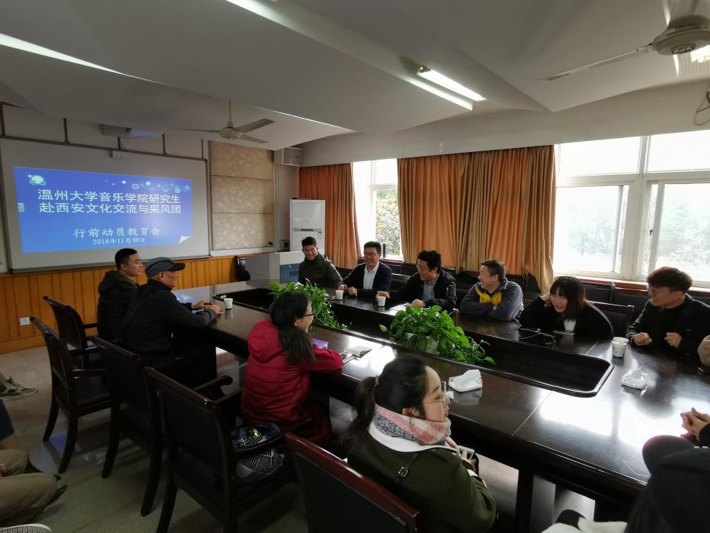 研究生西安文化交流与采风行前教育会。参会人员有赵玉卿、刘玉亭、冯百跃、叶文辉、周斌以及30名采风学生。