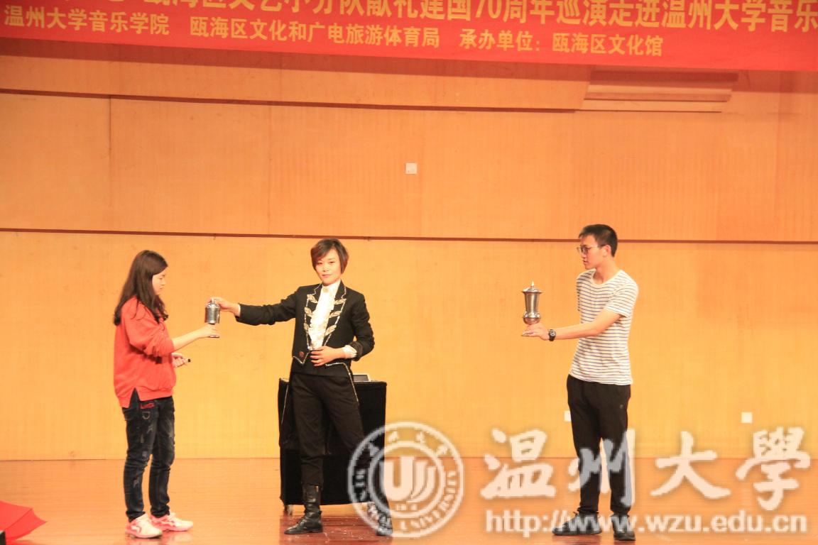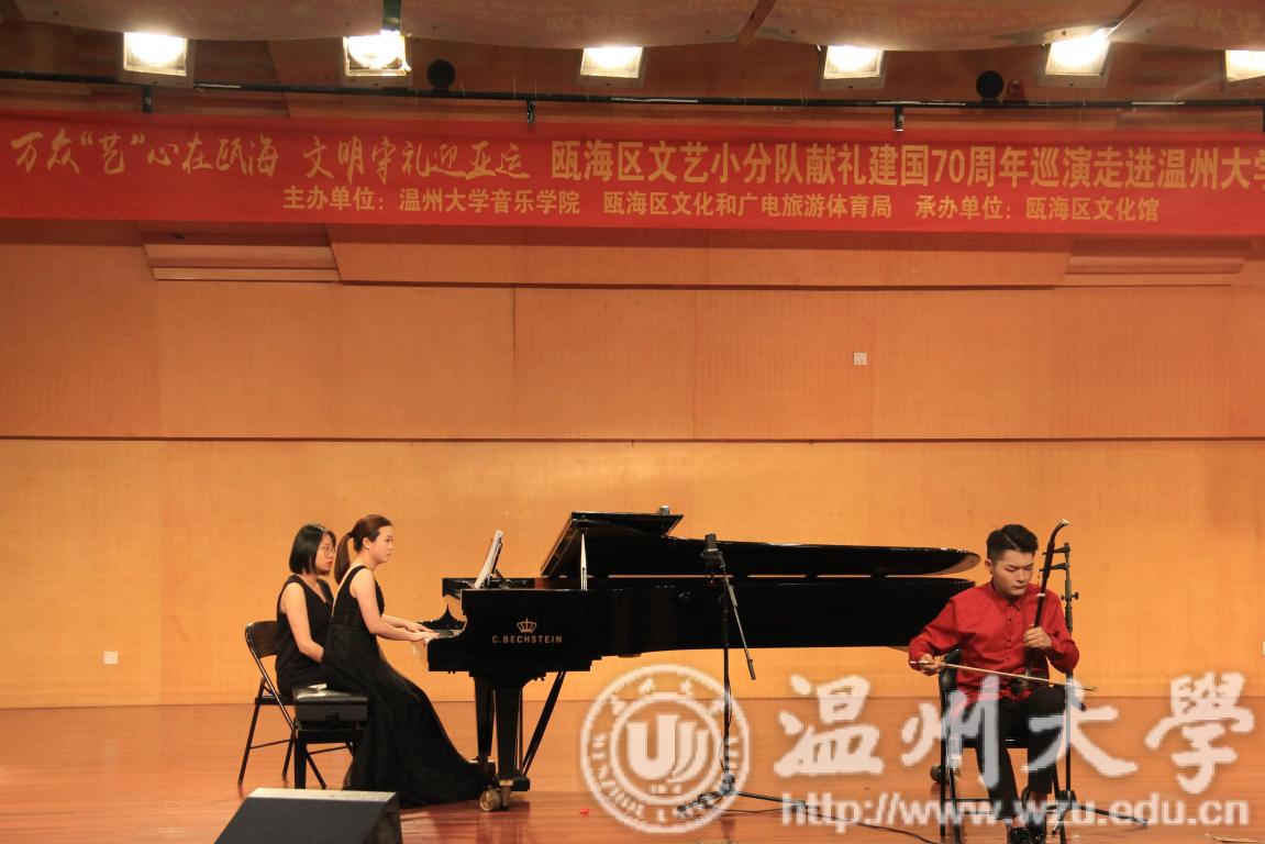 师生带来的二胡钢琴协奏曲和平衡术的反响最为热烈。《楚颂》描绘的是西楚霸王项羽和虞姬的爱情故事。歌曲前半段节奏舒缓、曲调哀伤,后半段节奏与前半段不同,节奏变快、曲调较为激昂。最后又在激昂的画面中回到了悲怆的场景里。整首曲目充满了戏剧性和矛盾,既悲又激。表达了西楚霸王项羽爱恋着虞姬,身为一国之君,为了国家兴亡又不能被儿女情长所困住,投身战场,最后乌江自刎的悲剧。一曲二胡钢琴协奏作品,真正体现了中西结合,赢得了现场最热烈的掌声!最后一个节目是男声独唱《永远跟党走》,真挚地表达了温州瓯海人民对祖国的热爱、对党的歌颂和赞扬!在一片合唱《歌唱祖国》中,主持人宣布本次活动到此结束,