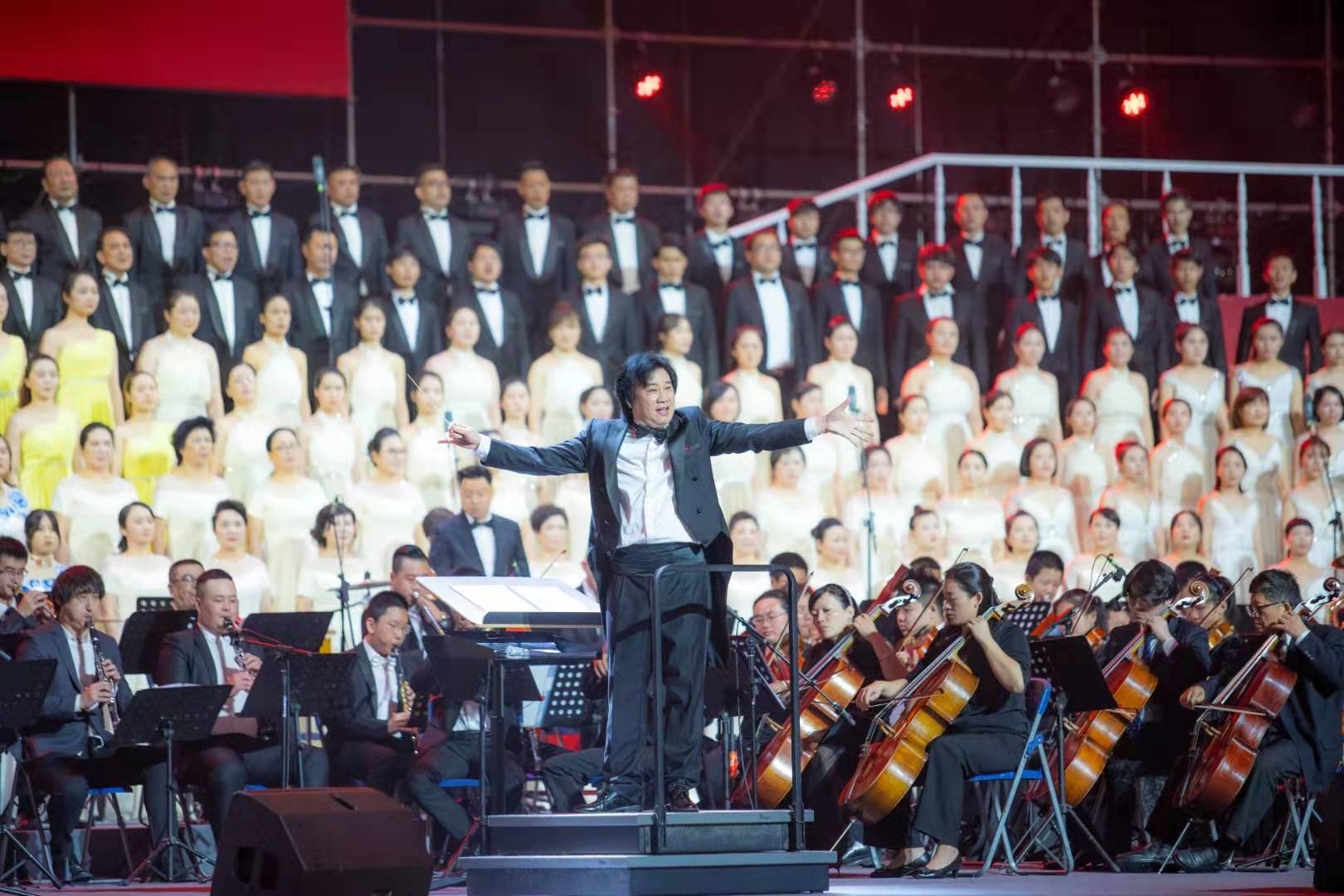 院长邹跃飞领衔,担任整场歌咏会的艺术总监。他还是现场百人乐队指挥,豪情满怀,用精准的挥拍带领全场高歌颂中华。